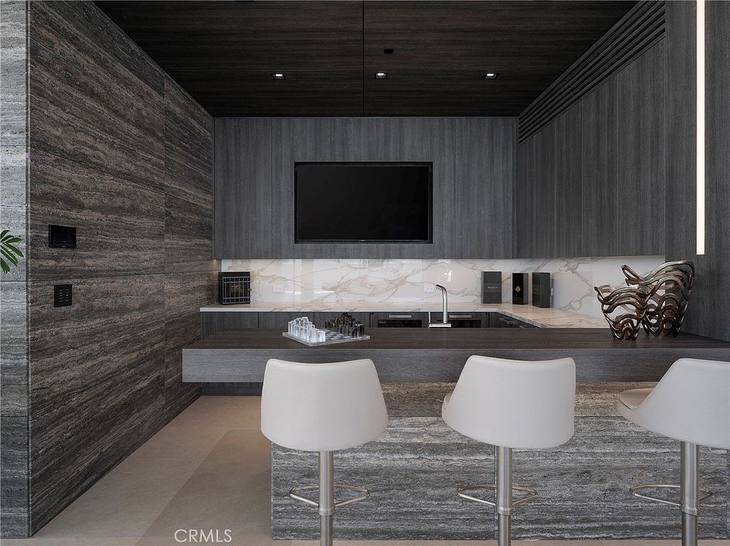Dark wood cabinetry and textured matte stone surfaces establish a sleek, contemporary look while providing ample storage and workspace for busy families. The open-plan bar area, accented by three white swivel stools, invites casual meals, conversations, and after-school snacks. A subtle marble backsplash with gray veining adds understated elegance, contrasting beautifully with the darker color palette. Built-in stainless appliances streamline the functional U-shaped space, keeping everything within reach. Ambient lighting and well-placed task lights ensure a warm, welcoming atmosphere. This kitchen blends upscale aesthetics with family-friendly design, making it ideal for everyday living and entertaining alike.