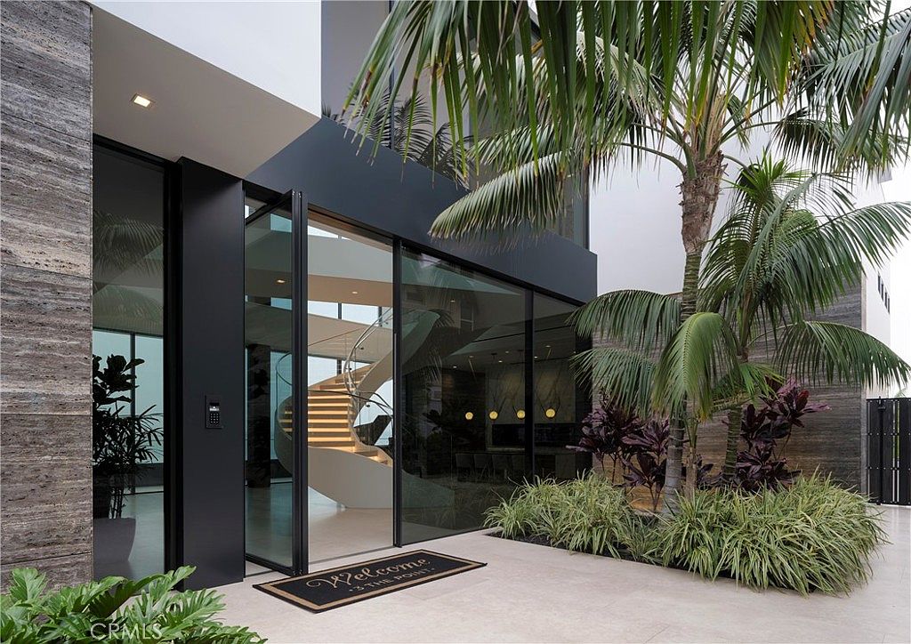 A striking entryway welcomes guests with a blend of luxury and relaxation. Tall glass doors framed in sleek black metal create a dramatic introduction, allowing natural light to pour into the foyer. Lush palm trees and manicured greenery soften the modern exterior, providing a family-friendly touch by blending indoor and outdoor living. Stone cladding and neutral tones set a tranquil, sophisticated mood. Inside, a sculptural floating staircase becomes a stunning centerpiece, promising a home that is both spacious and comfortable. The design encourages easy access and an inviting atmosphere for gatherings and everyday living.