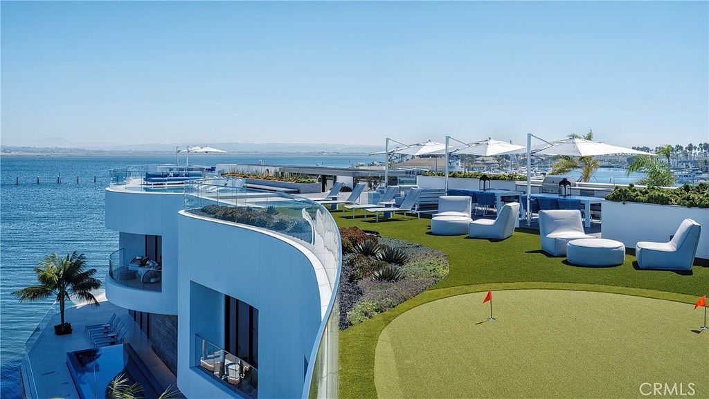 This stunning rooftop terrace offers breathtaking waterfront views and a contemporary layout ideal for entertaining and relaxation. The design features sleek, rounded architectural lines softened by abundant greenery and an expanse of manicured artificial turf, complete with an inviting putting green perfect for family fun or casual practice. Plush, modern lounge seating in muted blues and whites creates comfortable, shaded areas beneath oversized canopies, ensuring a resort-like atmosphere. The seamless glass railings maximize the view and allow natural light to flood the space, creating a vibrant and serene setting suitable for all ages and gatherings.