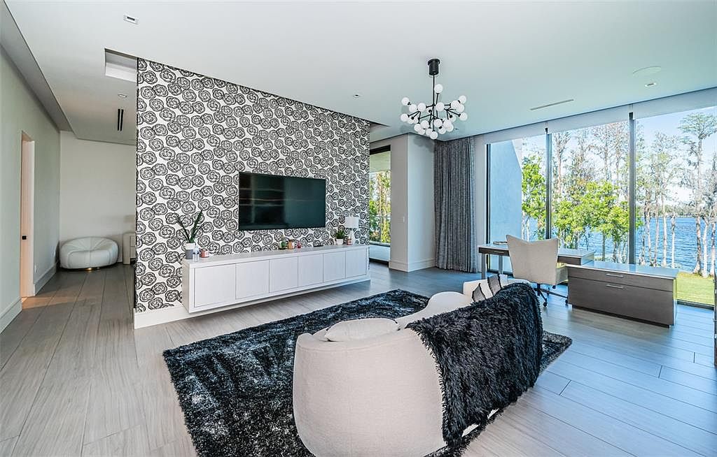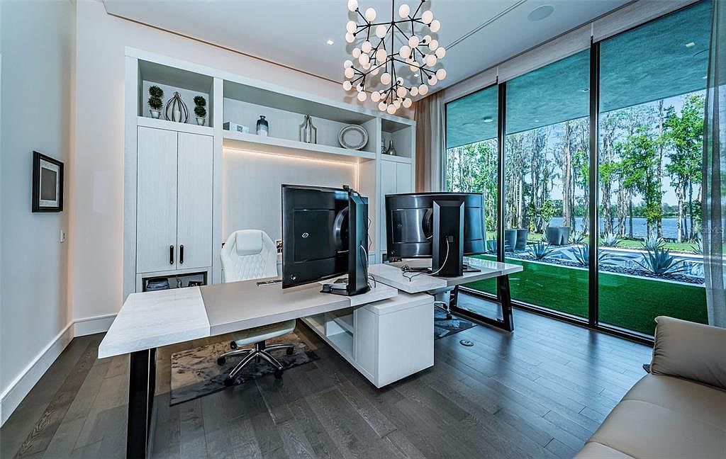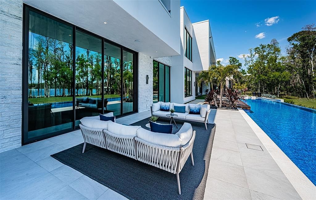 This newly constructed 2024 Odessa, FL estate epitomizes success and forward-thinking living with its striking modern architecture by Phil Kean set on a five-acre lakefront plot with breathtaking views of private Island Ford Lake. Priced at $37,500,000, the 23,000-square-foot sanctuary offers unmatched status appeal and privacy, secured by a stone wall and facial recognition gates. With world-famous art, a multi-million dollar infinity pool, tennis and pickleball courts, and private docks, this home caters to those driven by achievement and wellness. Highlights include a 4,200-square-foot covered lanai, guest house, lake cabin, movie theater, and state-of-the-art wellness amenities, positioning it as a premier haven for those who value luxury, innovation, and world-class entertaining close to Tampa Bay.