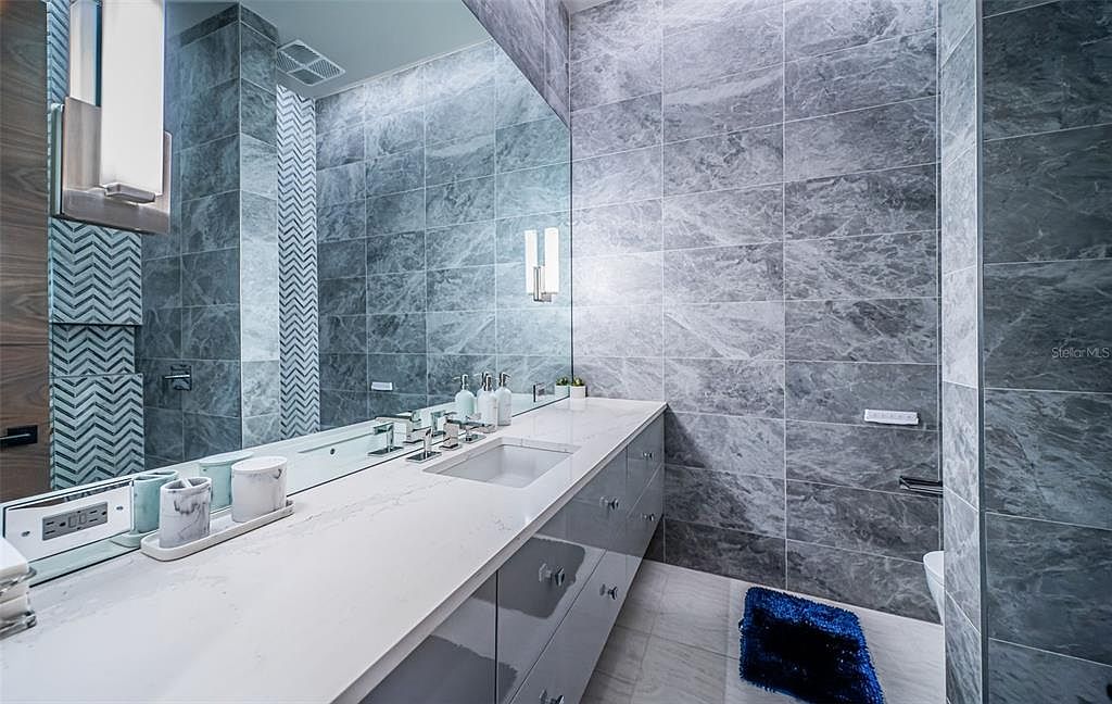 Sleek, contemporary design is showcased by floor-to-ceiling gray marble tiles and chevron-patterned accent walls in the shower area. A spacious floating vanity with a pristine white quartz countertop offers double sinks and ample storage, making it convenient for family use. The extended wall mirror enhances the sense of space and reflects light for a bright, airy feel. Subtle decorative accents, such as marble containers and a small plant, provide a touch of elegance. Bold blue floor matting adds a pop of color against the neutral palette, while soft lighting creates a welcoming, spa-inspired ambiance perfect for daily routines.