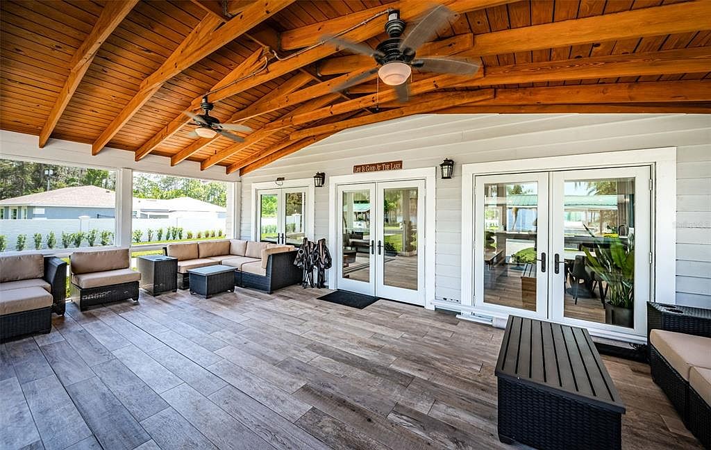 Expansive covered patio featuring a stunning wooden vaulted ceiling that adds rustic charm and warmth. The space is thoughtfully furnished with a generous L-shaped outdoor sectional and coordinating chairs, offering ample and comfortable seating for family gatherings or entertaining guests. The neutral color palette, with soft beige cushions and dark wicker frames, creates an inviting, versatile look. Large, wood-look tile flooring ensures durability and easy maintenance, perfect for active families. Ceiling fans enhance comfort in warmer months, while abundant natural light pours through the glass doors and windows, seamlessly connecting the patio with the home’s interior and the scenic yard beyond.