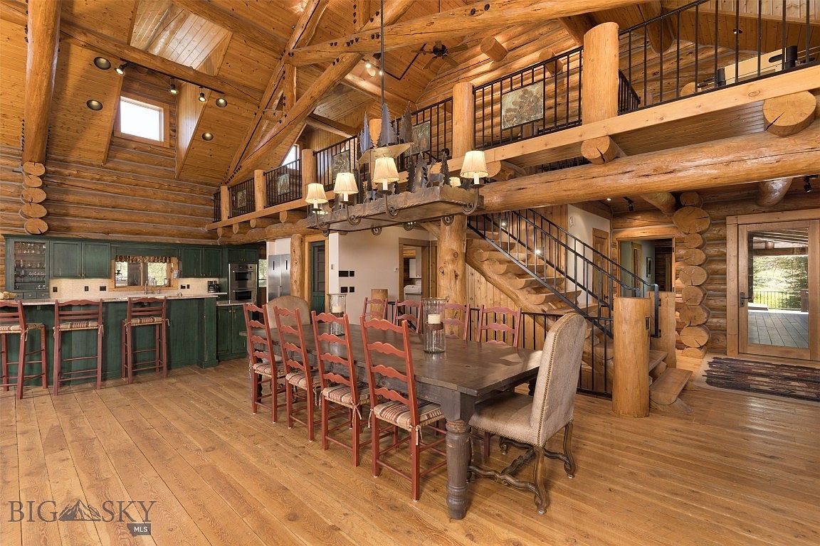 This spacious dining area blends rustic charm with modern comfort, featuring a large wooden table surrounded by elegantly designed chairs. The rich, polished wood floors enhance the warmth of the log cabin aesthetic while high ceilings accentuate the open layout. A striking chandelier, reminiscent of mountain lodge style, hangs above, casting a cozy glow over the space. The dark green cabinetry in the adjacent kitchen adds a pop of color, complementing the natural hues of the logs. Large windows invite ample natural light and offer a scenic view, creating an inviting atmosphere perfect for family gatherings.