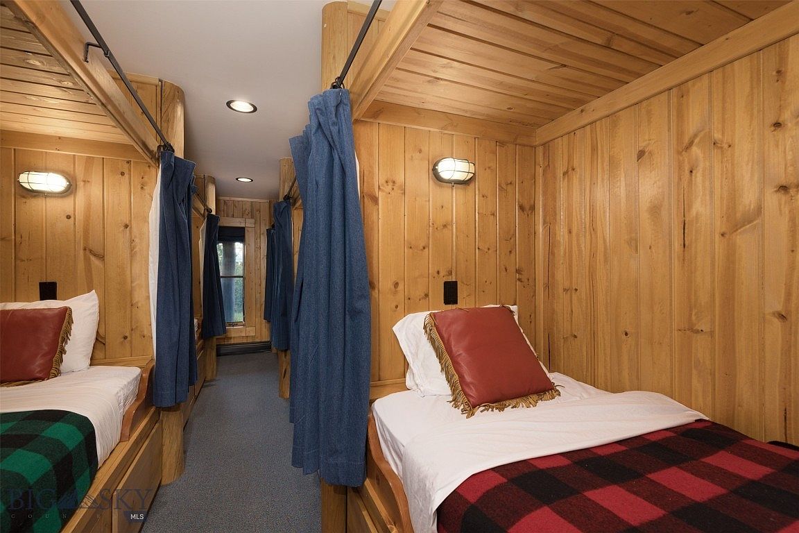 This charming bunk room showcases a warm, rustic aesthetic with natural wood paneling that envelops the space, creating a snug atmosphere. The room features two twin beds separated by soft fabric drapes, allowing for privacy and comfort. Each bed is accented with inviting plaid blankets and vibrant throw pillows, enhancing the cozy feel. Practical storage is integrated into the design, while recessed lighting provides a pleasant glow. A large window invites natural light, making the room bright and airy. Ideal for family gatherings, this layout promotes bonding while ensuring comfortable accommodations for guests.
