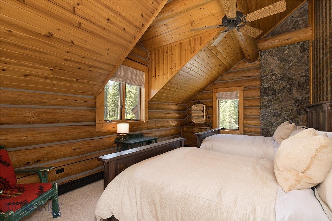 This enchanting bedroom features a rustic charm with warm wooden beams and log walls that exude a sense of tranquility. The sloped ceiling adds height and character, while ample natural light pours in through two strategically placed windows, highlighting the earthy tones. A plush, oversized bed is adorned with soft neutral linens and a multitude of cozy pillows, inviting relaxation. A vintage wooden dresser complements a small side table with a lamp, providing functional elegance. A striking stone accent wall adds to the room’s aesthetic, harmonizing beautifully with the comfortable, family-friendly atmosphere. This space is perfect for restful nights.