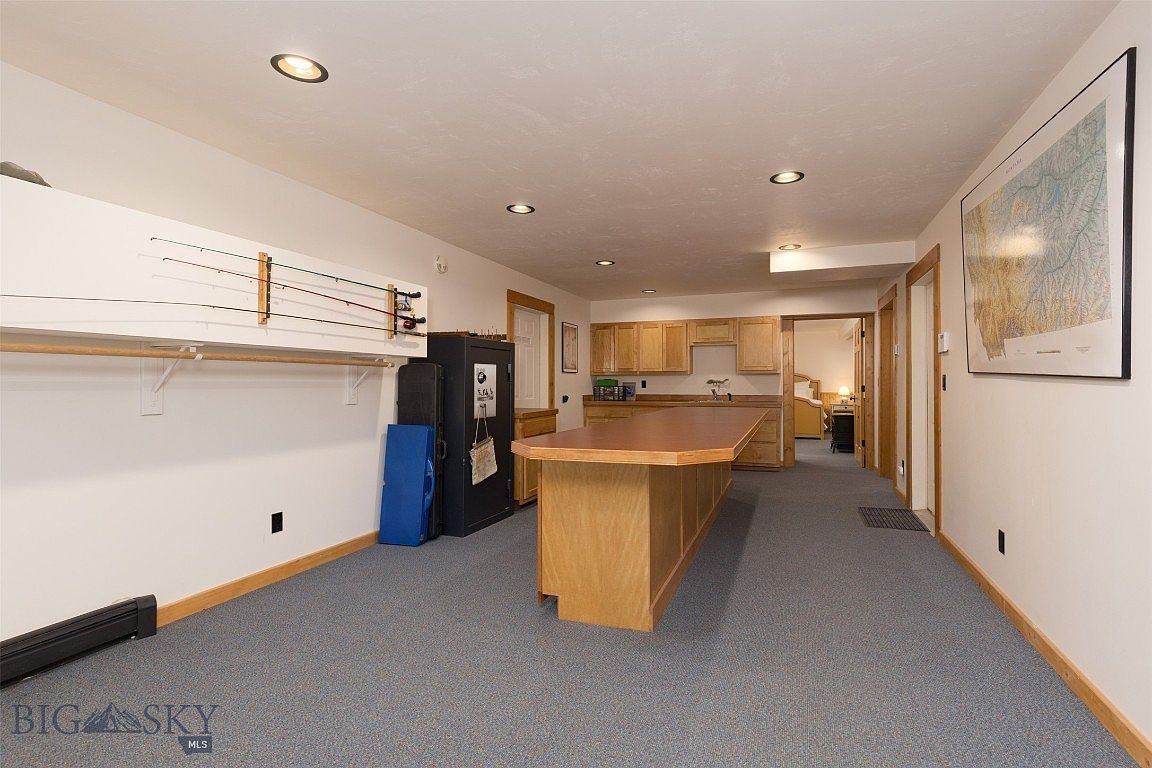 This mudroom seamlessly blends functionality with inviting aesthetics, ideal for an active family. Featuring a spacious layout, the room showcases an extensive countertop made of warm wood, perfect for organizing gear and preparing for outdoor adventures. Along one wall, fishing rods are neatly arranged, hinting at a lifestyle enriched by outdoor activities. The adjacent cabinetry offers ample storage while maintaining a clean, organized look. A plush carpet in soft blue adds comfort underfoot, harmonizing with the natural wood tones throughout. Bright overhead lighting enhances visibility, creating a bright and welcoming atmosphere for family gatherings and memories.