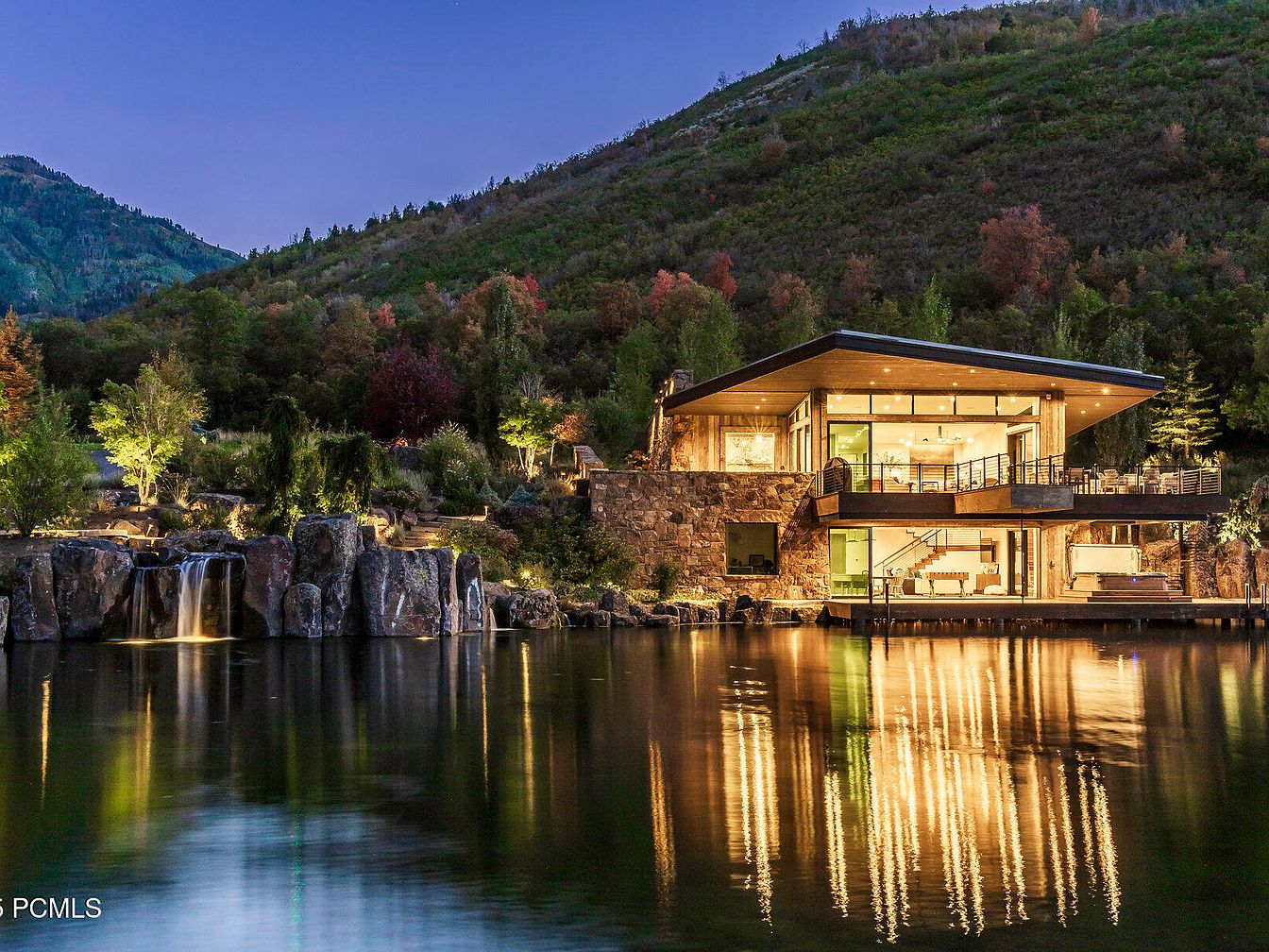 This stunning modern lakefront home features large glass walls that harmonize with the surrounding landscape, showcasing breathtaking reflections in the water. Crafted with natural stone and warm wood elements, the architecture blends seamlessly into the environment, creating a welcoming space. The expansive deck extends to the water, perfect for family gatherings and outdoor lounging. Surrounded by lush greenery and softly illuminated by landscape lighting, the property offers a serene ambiance. Inside, an open-concept layout encourages togetherness, complemented by contemporary furnishings and warm hues, making it an ideal retreat for relaxation and entertainment.