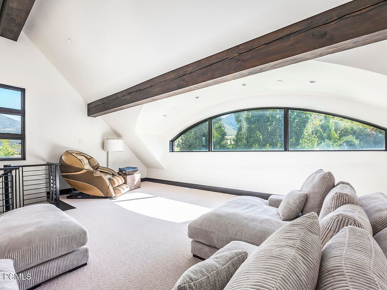 This inviting loft showcases a spacious layout, perfect for relaxation and family gatherings. The sloped ceiling, complemented by rich, exposed wooden beams, adds a warm rustic charm. Large, arched windows flood the space with natural light, framing serene views of the surrounding landscape. Plush, oversized sofas with soft, textured fabric offer cozy seating, while a stylish recliner chair provides a comfortable spot for quiet reading or leisure. The neutral color palette enhances the airy feel, making the loft ideal for playful activities or leisurely evenings. Thoughtfully designed, this space blends comfort and elegance for family-friendly living.