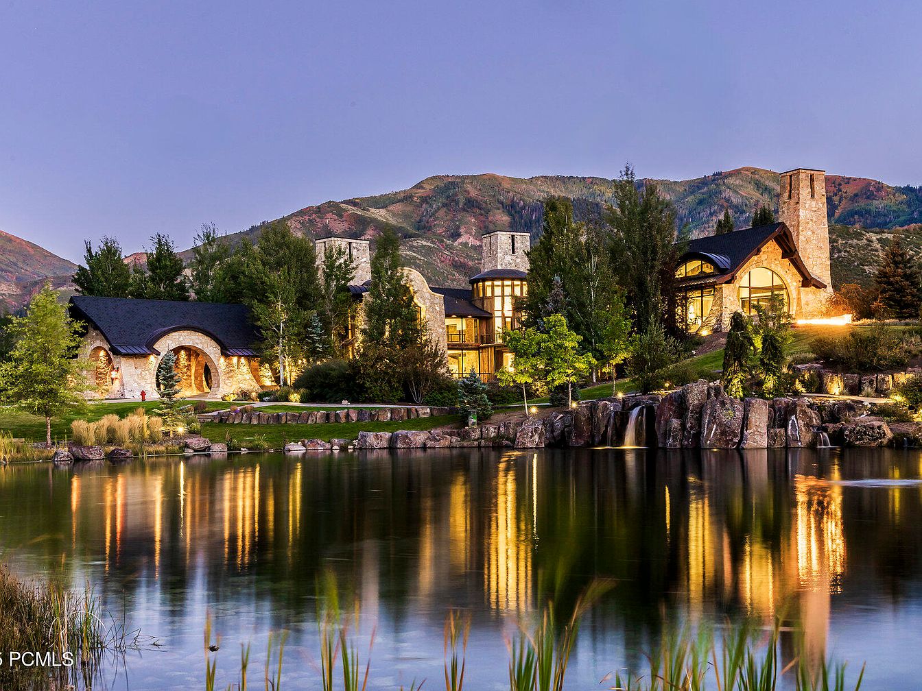 Nestled against a picturesque mountain backdrop, this stunning home boasts a harmonious blend of natural stone and modern design. Its expansive glass windows invite abundant natural light, offering breathtaking views of the surrounding landscape. A tranquil pond reflects the architectural beauty, while meticulously landscaped gardens enhance outdoor living spaces. Family-friendly features are prominent, including spacious patios and a natural stone fire pit perfect for evening gatherings. The warm, earthy color palette complements the tranquil environment, while prominent chimneys and unique rooflines lend a character that embodies both luxury and comfort in a serene setting.