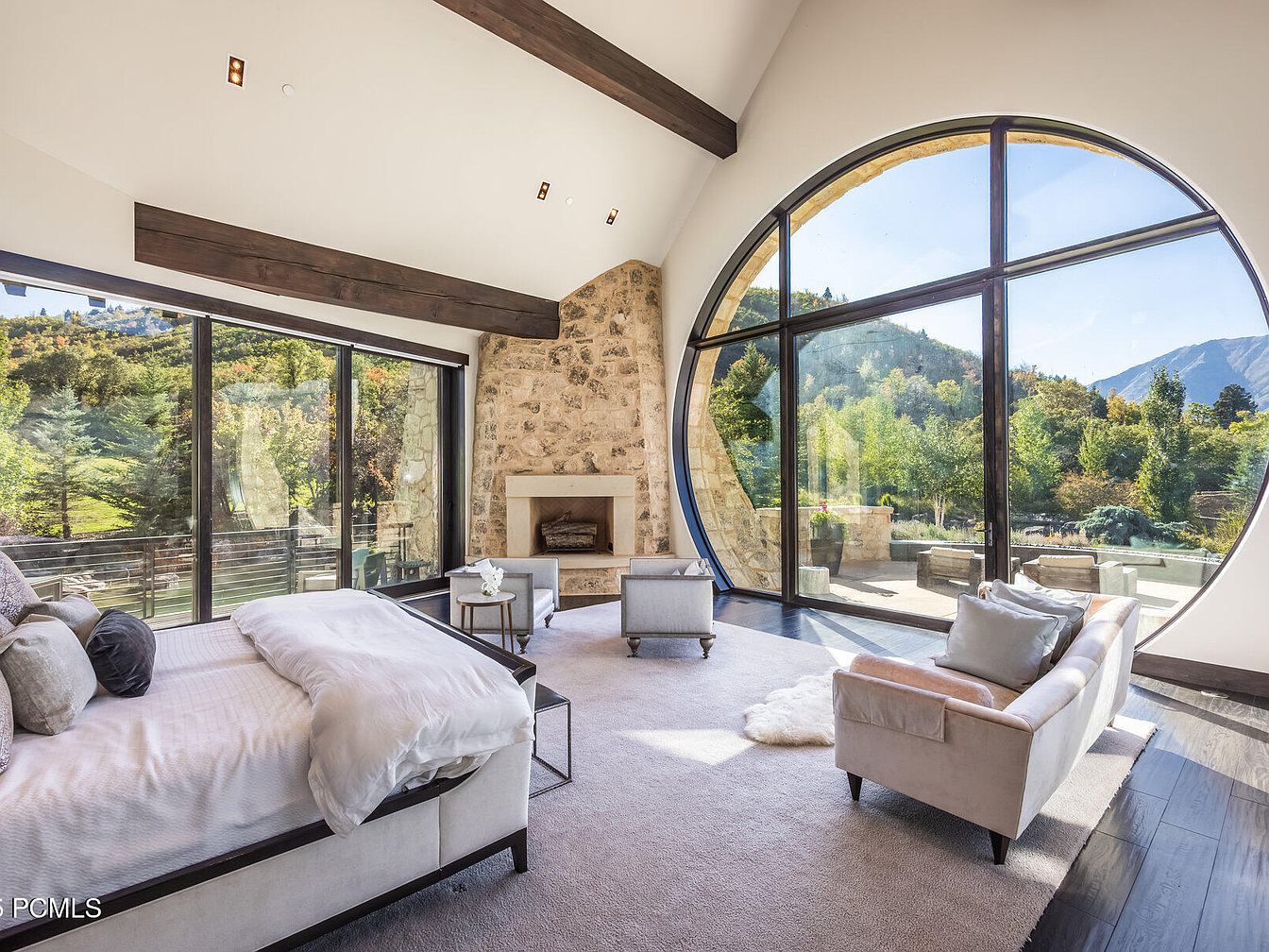 This master bedroom radiates serenity, featuring expansive floor-to-ceiling windows that offer breathtaking views of the landscape. The vaulted ceiling, adorned with dark wooden beams, contrasts beautifully with the soft, neutral color palette, enhancing the airy atmosphere. A cozy, plush bed invites relaxation, accompanied by elegant accent furnishings that add a touch of sophistication. The stone fireplace serves as a focal point, accentuating the room’s rustic charm while providing warmth. The layout promotes a seamless flow to an outdoor patio, perfect for family gatherings and morning coffee amidst nature’s tranquility. The rich textures create an inviting haven.