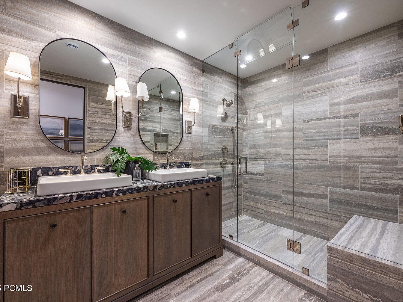 A modern master bathroom combines elegance with functionality, featuring a sleek dual-sink vanity topped with polished stone. The cabinetry, crafted from rich wood, adds warmth, while the oval mirrors reflect a sophisticated design. Stylish sconces illuminate the space softly, enhancing the tranquil atmosphere. Neutral gray tiles cover the walls and floor, creating a seamless flow throughout. A spacious glass shower, equipped with contemporary fixtures, showcases a minimalist aesthetic. Family-friendly elements include ample storage options and striking details such as a decorative plant, unifying comfort and style. This serene retreat emphasizes luxury and thoughtful design.