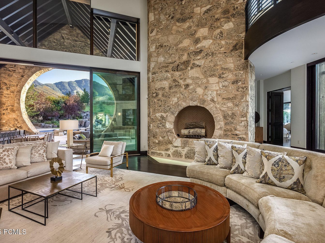 This spacious living room blends modern aesthetics with rustic charm, featuring an impressive stone accent wall that adds texture and warmth. Large, circular windows frame breathtaking mountain views, inviting natural light and a breath of fresh air. A plush, curved sofa envelops the space, adorned with stylish throw pillows that echo subtle earth tones. A sleek wooden coffee table sits at the center, providing a functional yet beautiful focal point. Nearby, a unique fireplace with a herringbone design offers a cozy ambiance. The room’s neutral palette, accented by natural materials, creates a serene environment ideal for family gatherings and relaxation.