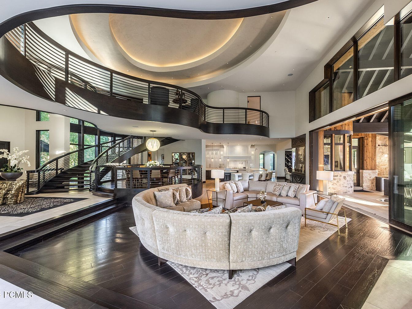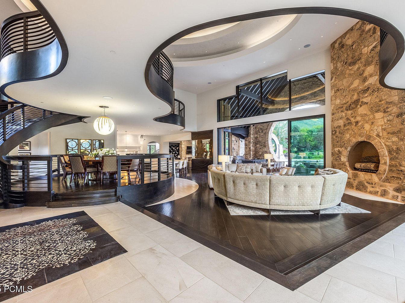 An inviting grand foyer showcases a magnificent open layout with sweeping curved lines that draw the eye upward. The elegant spiral staircase, framed in rich dark wood, spirals gracefully to the upper levels. Soft lighting from a stunning pendant illuminates the space, complementing the neutral color palette of beige and brown tones. The cozy circular sofa offers a touch of luxury, while the contemporary stone fireplace adds warmth and charm. Expansive windows usher in natural light and provide superb views of the surrounding landscape. This family-friendly area is perfect for gatherings, blending sophistication with comfort.