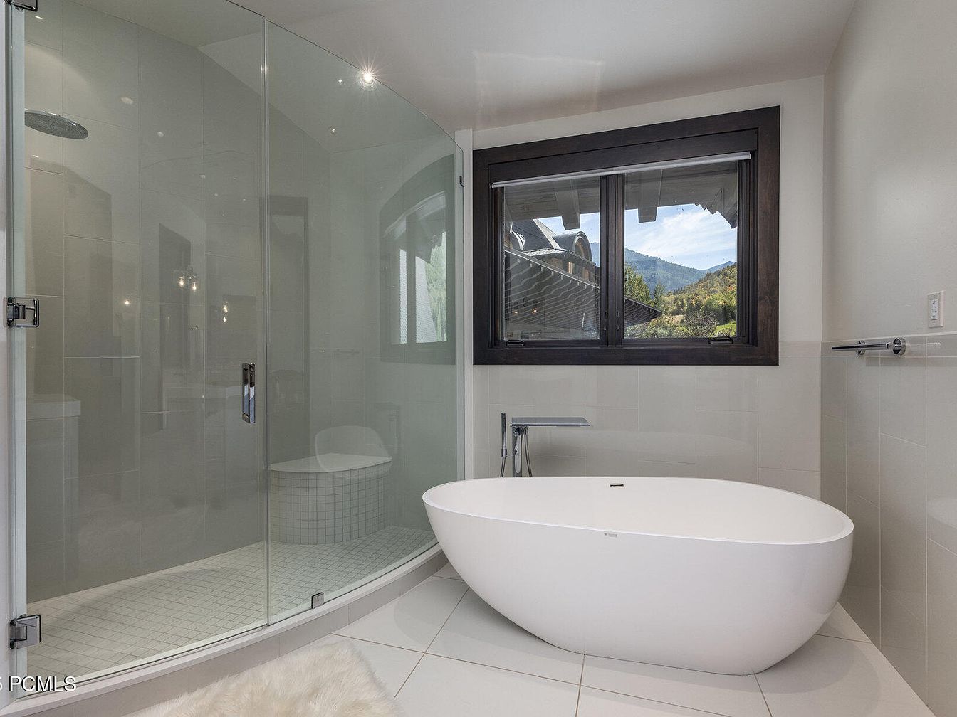 This modern bathroom features a serene and spacious layout, designed to create a soothing atmosphere. The curved glass shower adds elegance, while the freestanding tub offers a luxurious focal point. Rich, dark wood frames the windows, drawing the eye to breathtaking mountain views, blending interior comfort with nature. Neutral tiles in soft whites and light grays accentuate the clean lines and modern fixtures, making the space feel airy and open. Thoughtfully chosen lighting complements the design, enhancing the overall tranquility. Family-friendly touches ensure practicality without sacrificing style, creating an ideal haven for relaxation and rejuvenation.