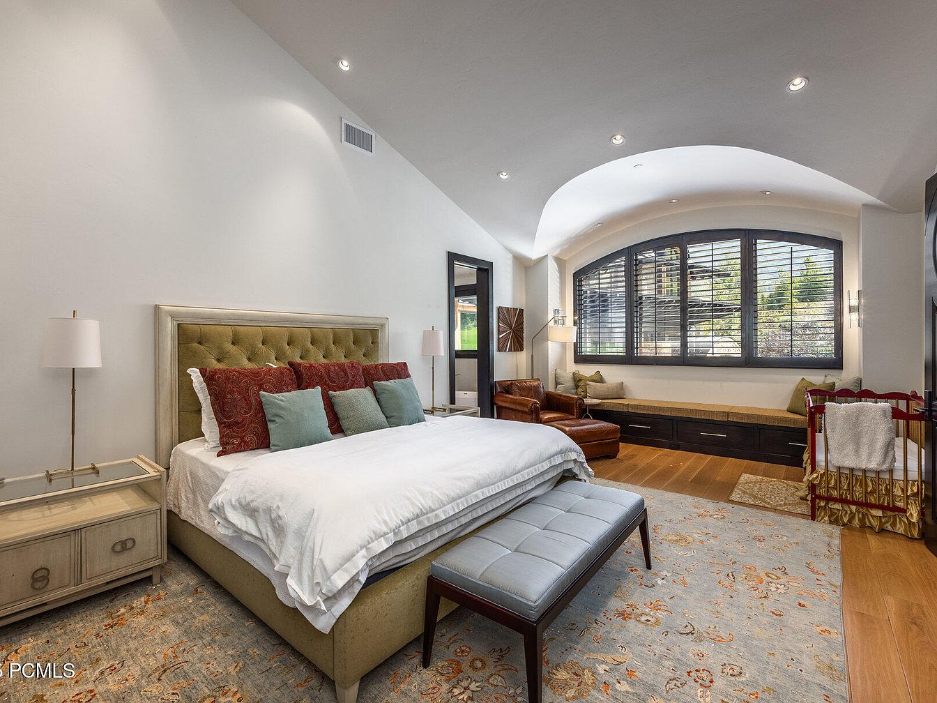 This serene master bedroom features a cozy king-sized bed adorned with plush pillows and a soft, inviting blanket. The tufted headboard adds a touch of elegance, while the complementary nightstands with lamps provide both functionality and style. A spacious window nook offers a soothing view, enhanced by custom shutters, perfect for relaxation with a built-in bench. Rich wooden flooring contrasts beautifully with the soft tones of the area rug. A comfortable leather armchair creates an intimate reading corner, while a stylish crib signifies a family-friendly atmosphere. The overall color palette embraces warm neutrals, promoting a peaceful ambiance.