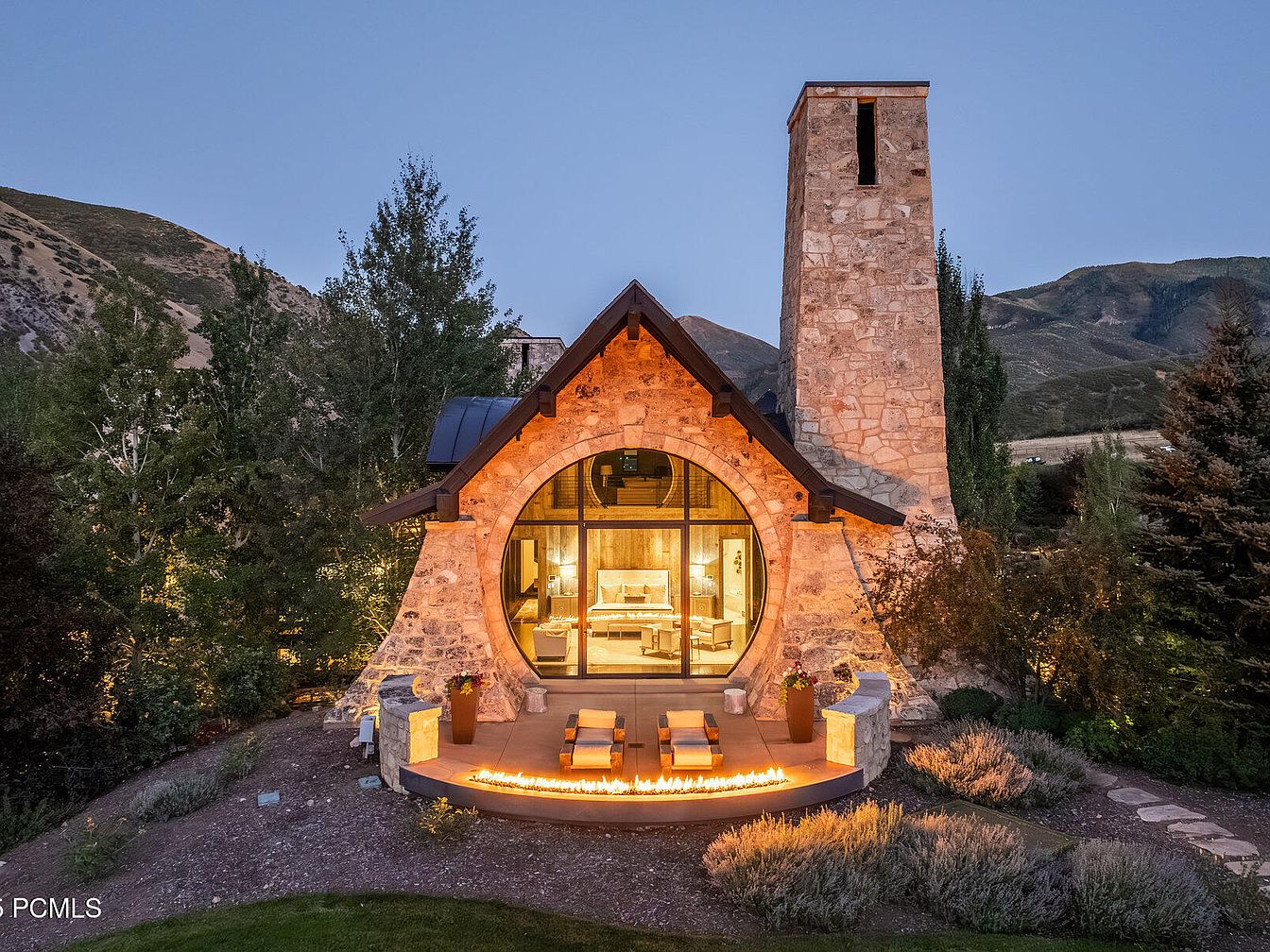 This stunning outdoor lounge features a unique, round design complemented by rustic stone and wooden elements. The expansive patio, illuminated by a flickering fire feature, offers a warm and inviting space for gatherings. A backdrop of majestic mountains enhances the serene atmosphere, while carefully curated landscaping adds texture and color. The large glass openings provide a seamless transition between indoor and outdoor living, fostering connection with nature. Neutral tones harmonize with the surrounding landscape, while comfortable seating guarantees a family-friendly environment perfect for relaxation and entertaining. Ideal for sipping evening drinks or enjoying sunny afternoons.