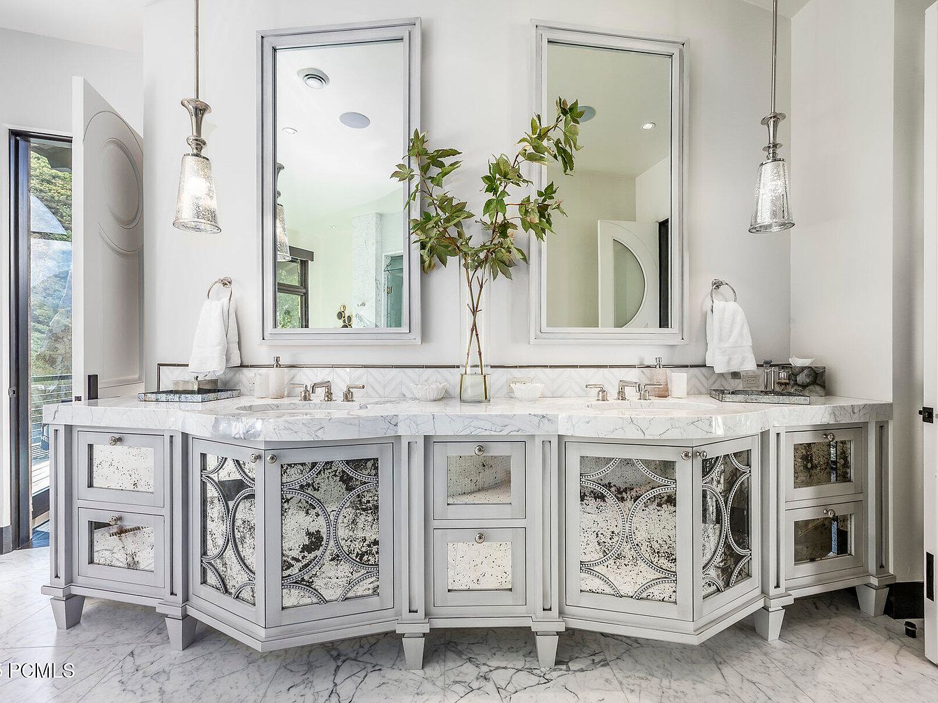 This sophisticated bathroom features a unique corner vanity with a stunning marble countertop, combining functionality and beauty. The cabinetry, adorned with mirrored panels, reflects light, enhancing the space’s brightness and elegance. Complemented by stylish pendant lighting, the double mirrors create a sense of spaciousness while highlighting the thoughtful design. A soft color palette of light grays and whites exudes serenity, making it ideal for relaxation. The ample storage provided by elegantly crafted drawers ensures practicality, catering to a family’s needs while maintaining an upscale aesthetic. Fresh greenery adds a touch of nature, enhancing the overall tranquil atmosphere.