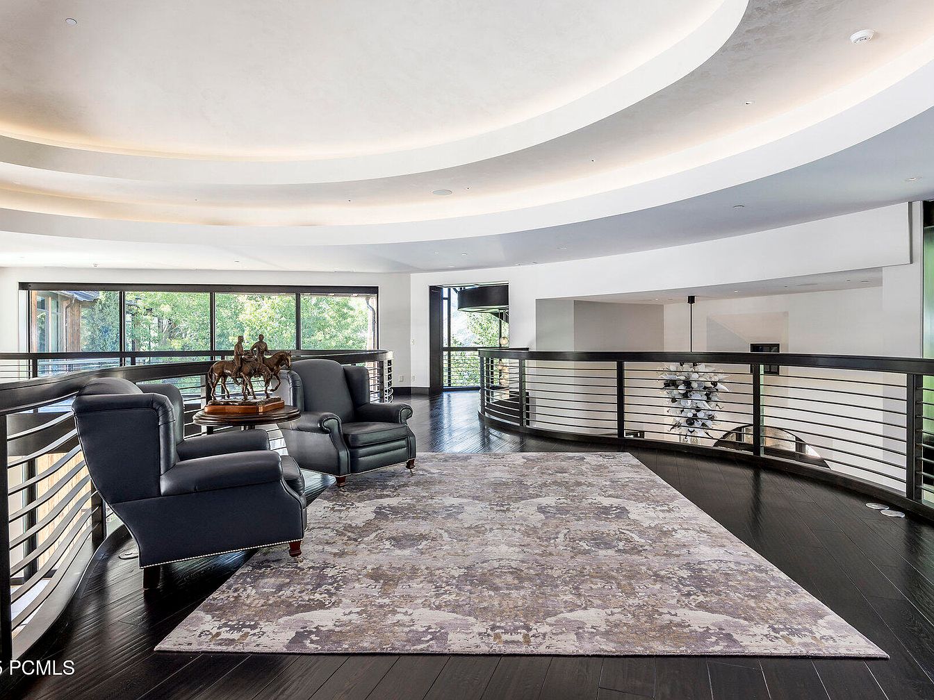 This spacious upper living area features a sophisticated blend of modern design and comfort. The room is adorned with rich, dark hardwood flooring which contrasts beautifully against the light, airy walls and ceiling that curve elegantly overhead. Luxurious leather chairs invite relaxation, while a decorative coffee table adds a touch of sophistication. Large windows allow for abundant natural light, enhancing the openness and connection to the outdoors, making it family-friendly. The stylish area rug anchors the seating arrangement, contributing to the overall warmth. A contemporary chandelier above creates an inviting ambiance, perfect for gatherings.