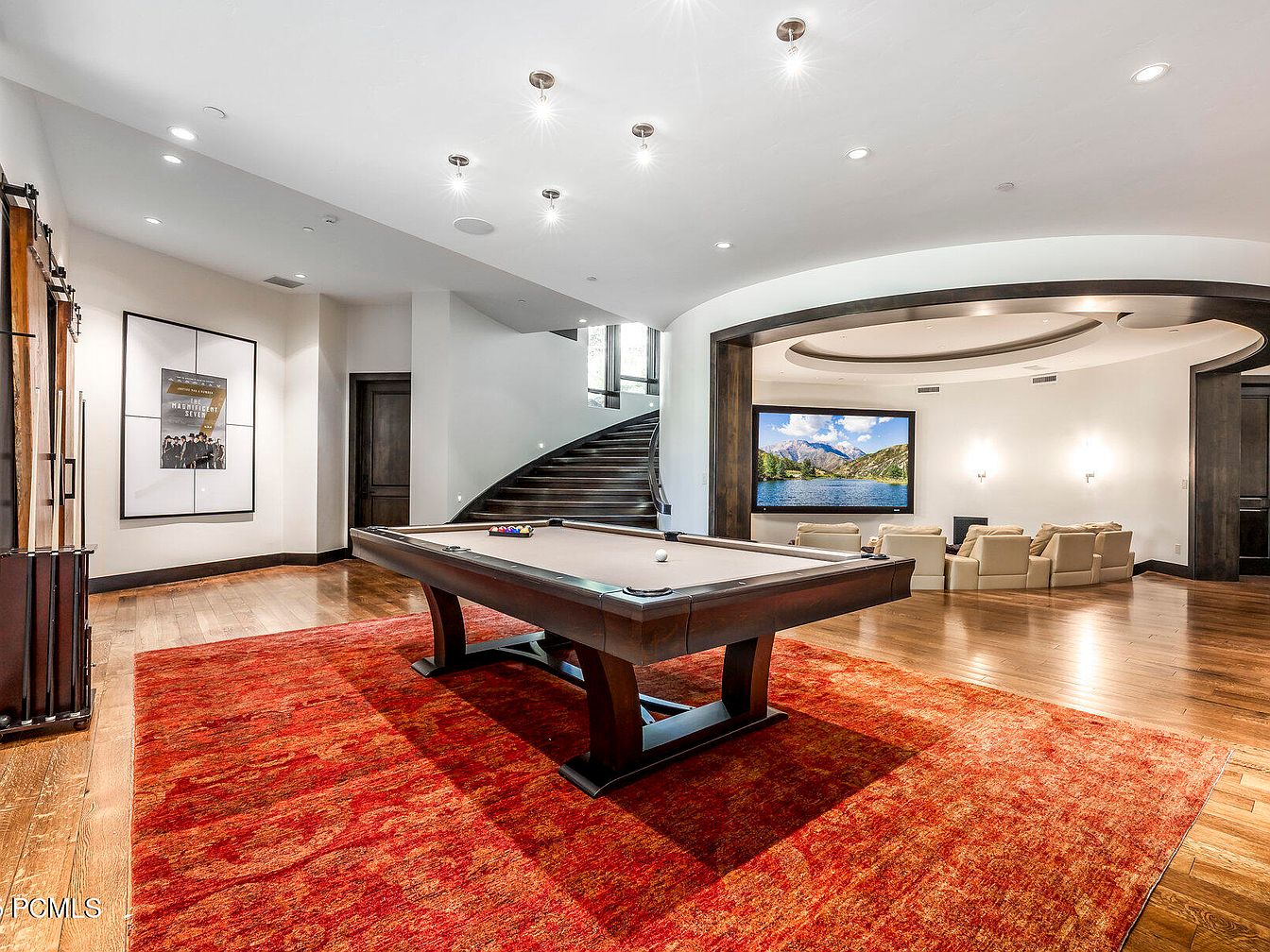 This spacious recreation room combines entertainment and comfort seamlessly. A stylish pool table takes center stage, flanked by a vibrant red area rug that adds warmth to the dark hardwood flooring. Soft, cream-colored seating creates an inviting space for family gatherings or movie nights, facing a large, mounted screen that promises endless entertainment options. The room’s design features elegant, rounded architectural details, while recessed lighting and modern fixtures provide ample illumination. Rich, dark wood accents throughout enhance the contemporary aesthetic, making this a perfect retreat for leisure and relaxation, ideal for family fun and socializing.