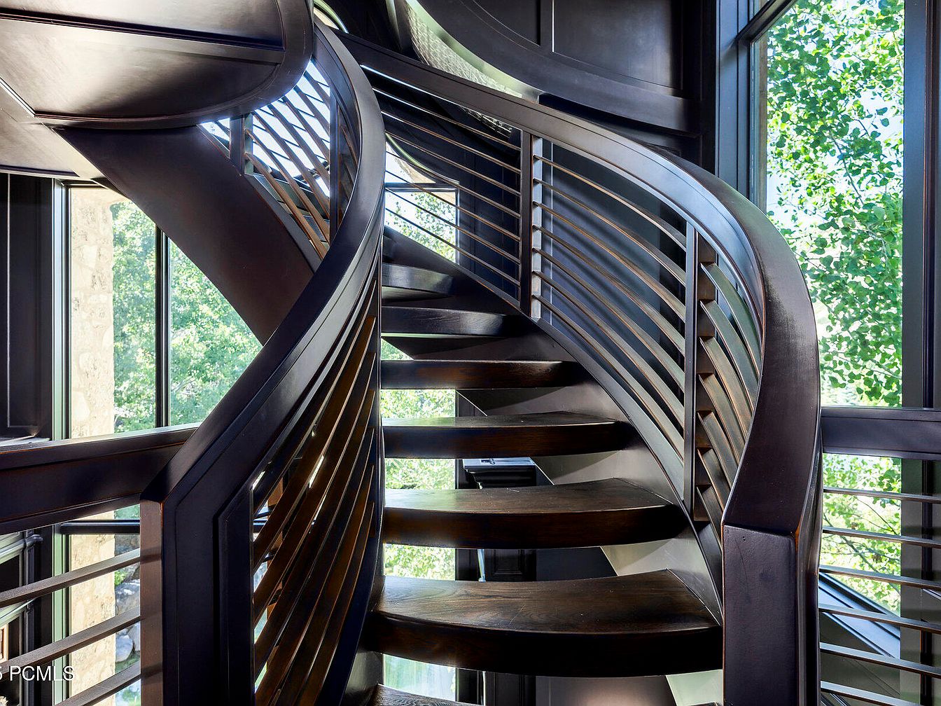 This elegant spiral staircase serves as a striking centerpiece, showcasing a blend of modern design and functionality. Crafted with rich, dark wood, each step smoothly ascends in a fluid form, supported by sleek, contemporary railings. Expansive windows fill the space with natural light, highlighting the intricate details of the architecture and inviting the lush greenery outside into the home. The open layout enhances the feeling of spaciousness, while the polished finishes add a touch of sophistication. Ideal for family living, this staircase balances style and safety, providing a graceful transition between levels.