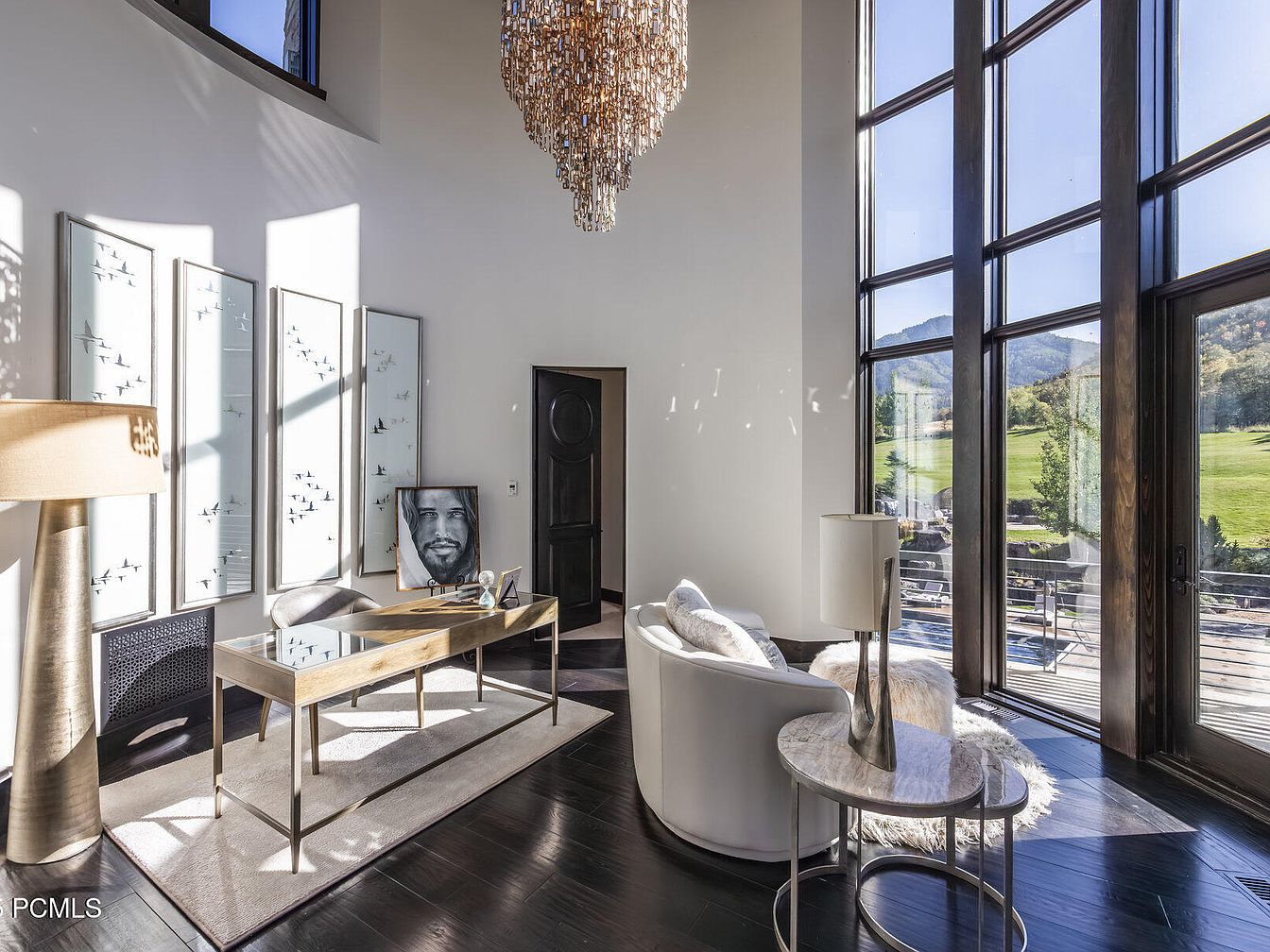 This stylish home office features an inviting layout with expansive windows that flood the space with natural light, showcasing stunning outdoor views. The walls are adorned with artistic panels, adding elegance and a personal touch. A sleek gold-trimmed desk pairs harmoniously with a plush white sofa, creating a balance of comfort and sophistication. The dark hardwood floors provide a warm contrast to the light color palette of the walls and furniture. A modern chandelier hangs overhead, casting a soft glow, while thoughtful decor elements like a chic lamp and tasteful artwork enhance the inviting atmosphere, perfect for productivity and relaxation.