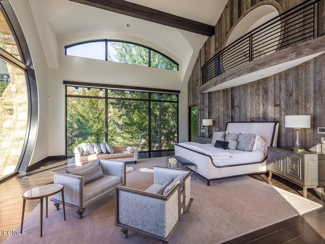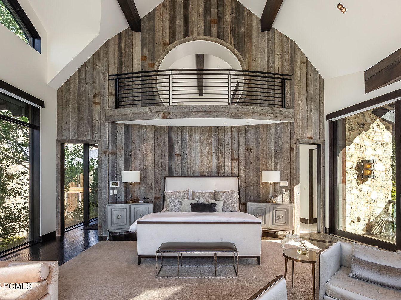 This master bedroom features a striking blend of rustic charm and modern elegance. The vaulted ceiling showcases exposed wooden beams and a unique circular balcony, creating an airy atmosphere. Rich, textured wood paneling contrasts beautifully with the light, neutral color palette, while large windows frame the inviting outdoors, ensuring ample natural light. A plush, inviting bed serves as the centerpiece, flanked by stylish nightstands with contemporary lamps. Cozy seating options, including a soft armchair and sleek bench, offer family-friendly comfort. The thoughtful layout encourages relaxation, making it an ideal retreat for unwinding after a long day.
