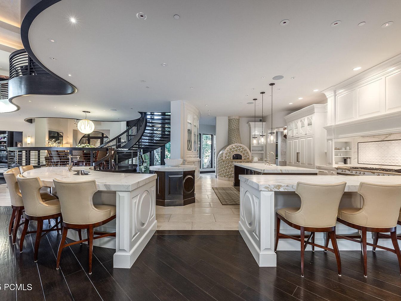 This elegant kitchen features a spacious island with a stunning marble countertop, perfect for family gatherings. High-backed, upholstered chairs in a soft cream tone provide comfortable seating. The contrast of dark hardwood flooring enhances the airy ambiance created by large windows and an open layout. Sleek white cabinetry with intricate molding complements a contemporary oven and decorative tile backsplash. A striking spiral staircase leads to an upper level, while the custom pizza oven adds a unique touch to the culinary space. This inviting design balances functionality with modern aesthetics, making it a welcoming hub for home-cooked meals.
