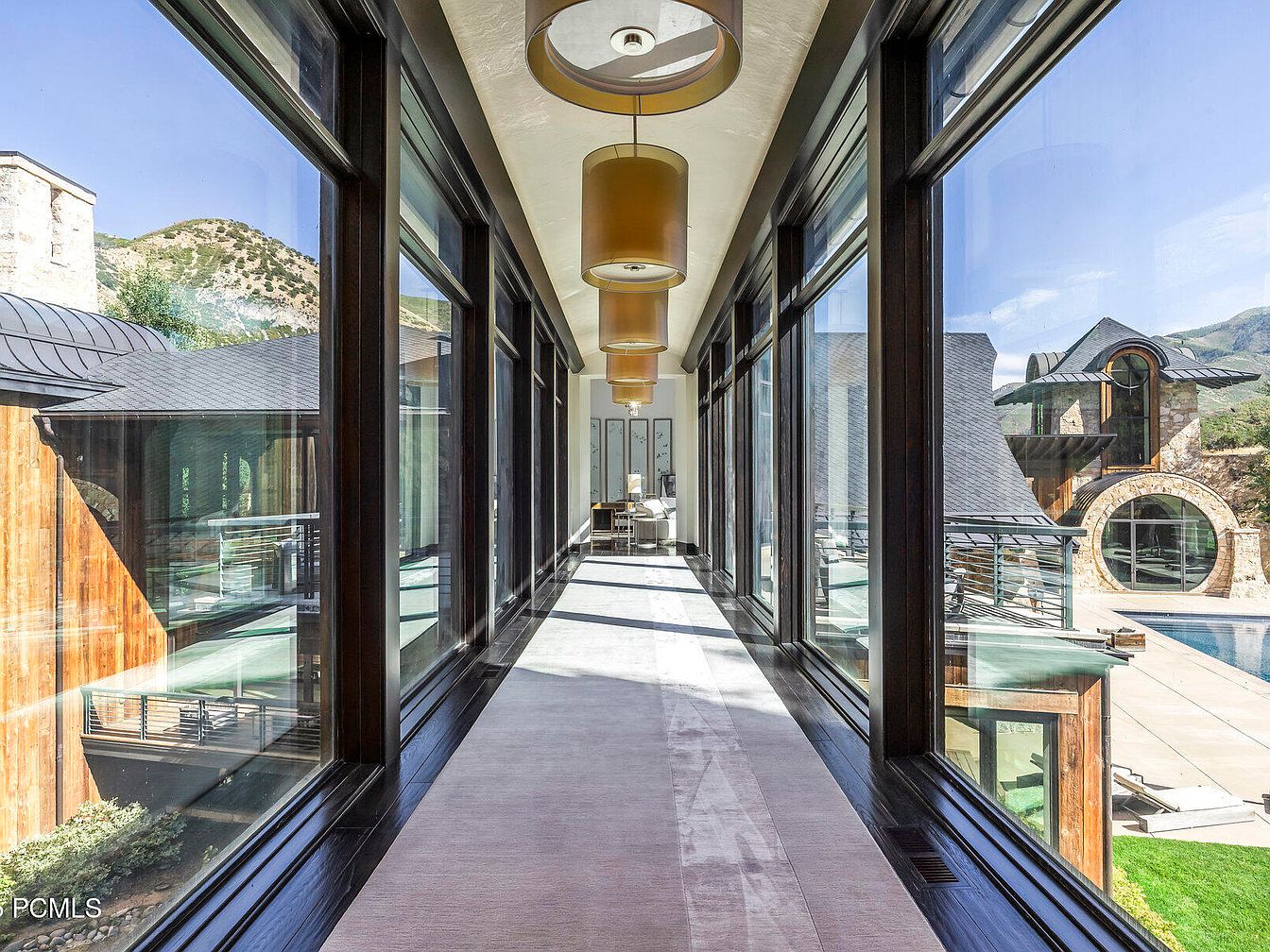 This beautifully designed hallway exudes sophistication with its expansive glass walls bringing in natural light and offering stunning views of the surrounding mountains. The sleek, dark hardwood flooring complements the light, neutral walls, creating a seamless flow throughout the space. The contemporary pendant lighting adds a touch of elegance while ensuring practicality. Family-friendly features abound, with ample space for easy movement and visibility. Cozy seating areas along the walls invite relaxation, making it perfect for casual conversations. Architectural details like the modern ceiling design enhance the overall aesthetic, merging comfort with modern living seamlessly.