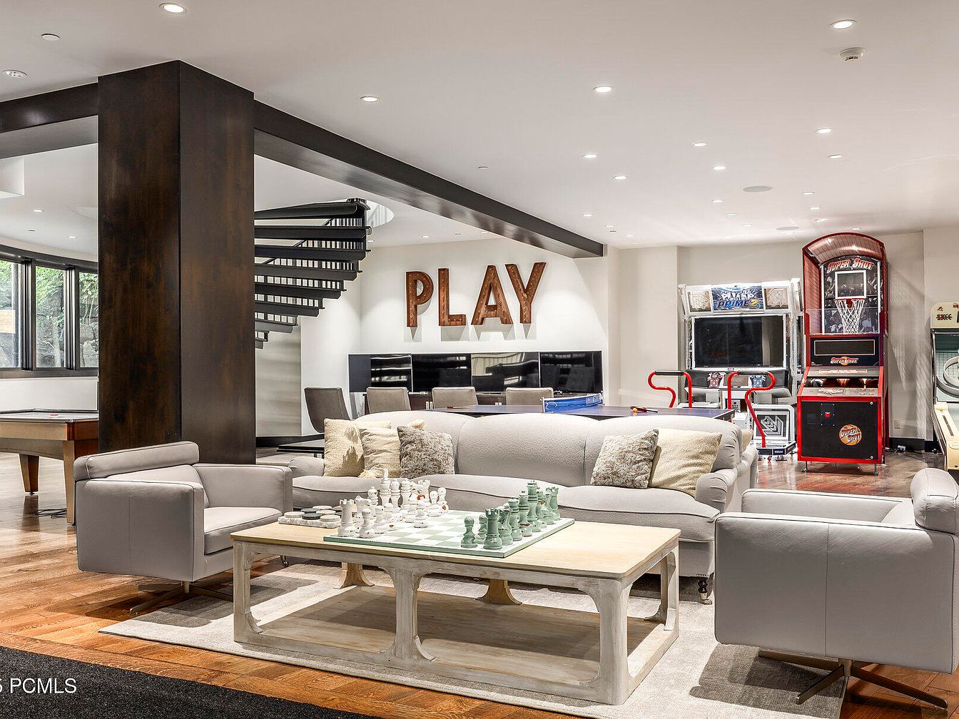 This vibrant family game room boasts an open layout, promoting a sense of connection and fun. The centerpiece is a plush, light-colored sofa adorned with decorative pillows, perfect for relaxation and gatherings. An elegant coffee table showcases a chess set, inviting playful competition. The dramatic wooden support pillar adds architectural interest, while the sleek spiral staircase leads to an upper level, enhancing the modern aesthetic. A striking ‘PLAY’ sign commands attention on the wall, complementing the array of arcade games and a pool table that provide entertainment for all ages. Warm wood tones and neutral colors create an inviting atmosphere.