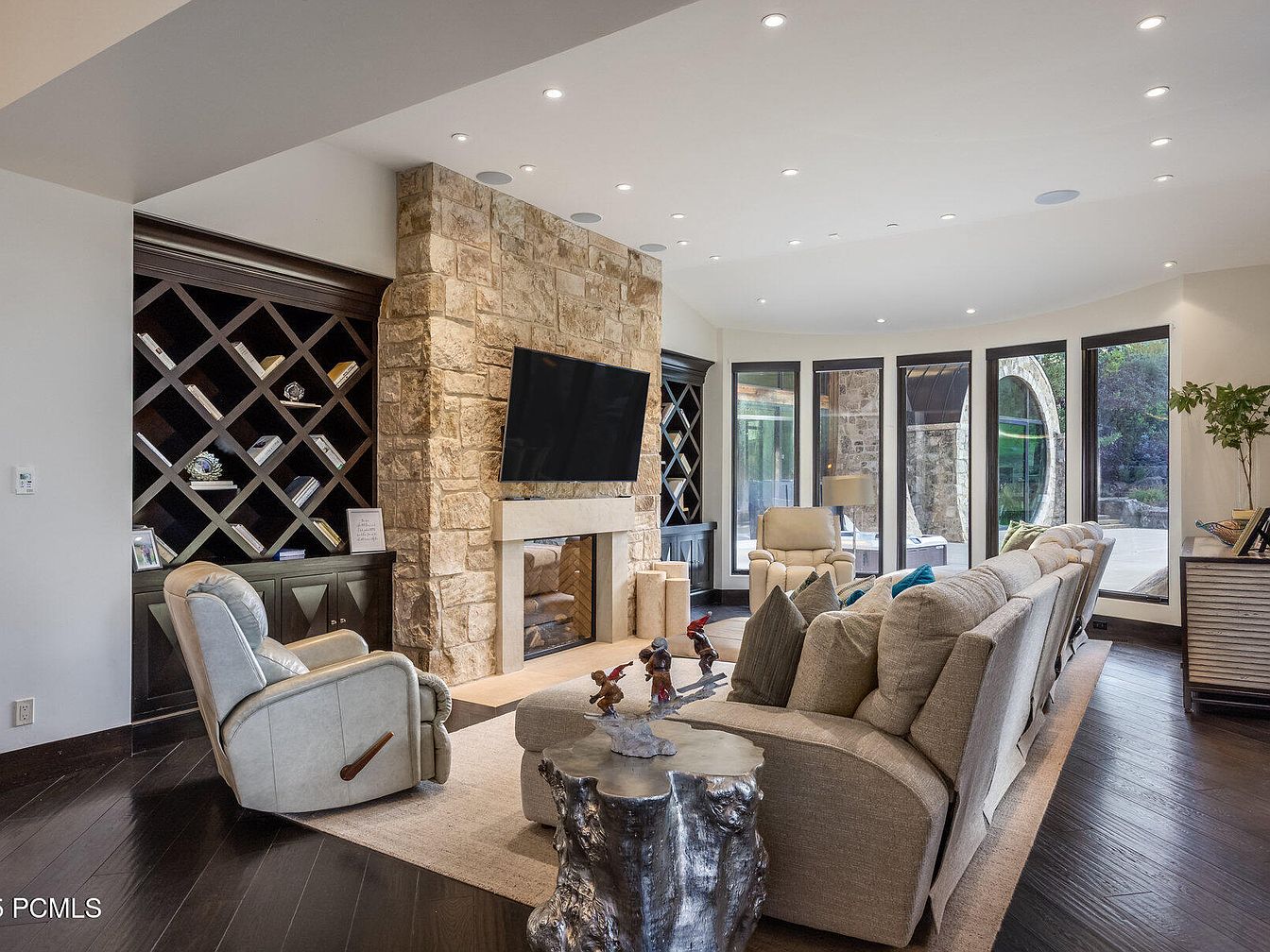 A spacious living room boasts an inviting layout with large, floor-to-ceiling windows that seamlessly merge indoor and outdoor spaces. The focal point is a stunning stone fireplace that adds rustic charm, complemented by sleek, contemporary furniture in soft, neutral tones. A plush sectional invites family gatherings, while accent pillows add pops of color. The rich, dark wood flooring contrasts beautifully with the lighter furniture, enhancing the room’s warmth. A built-in bookshelf provides both style and practicality, showcasing personal treasures. This family-friendly space encourages relaxation and social interaction, making it perfect for both intimate evenings and lively gatherings.