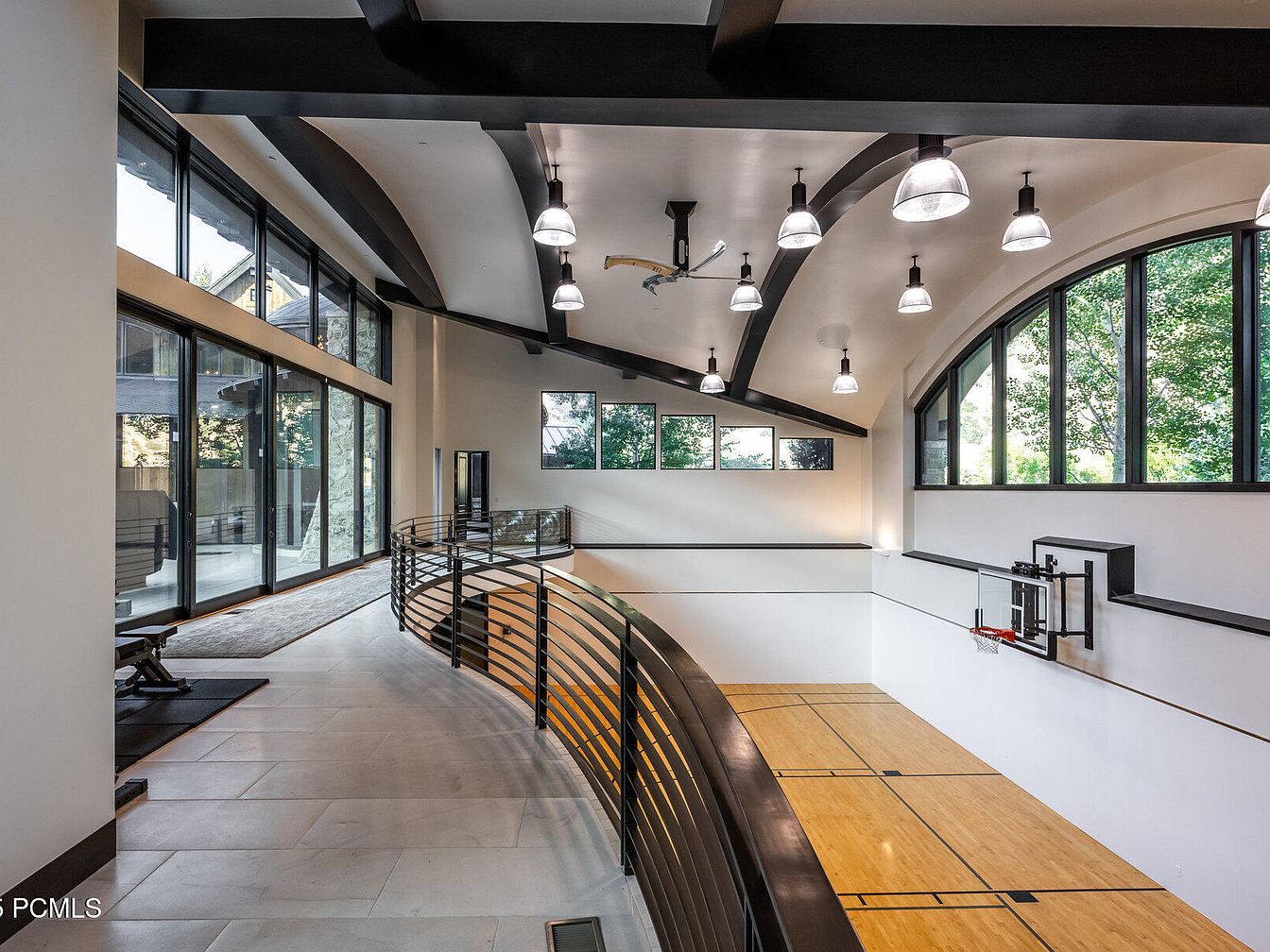 A stunning home gym features a sleek open layout, maximizing light with expansive windows and a high ceiling. The striking architectural elements include exposed black beams and modern pendant lighting, enhancing the spacious feel. The hardwood flooring, marked with basketball court lines, invites family fun and fitness. A curved balcony provides a unique viewing spot, perfect for overseeing games or workouts. This design prioritizes both aesthetics and functionality, creating an environment that encourages activity while fostering togetherness. The neutral color palette complements the vibrant outdoor views, seamlessly blending the interior with nature.
