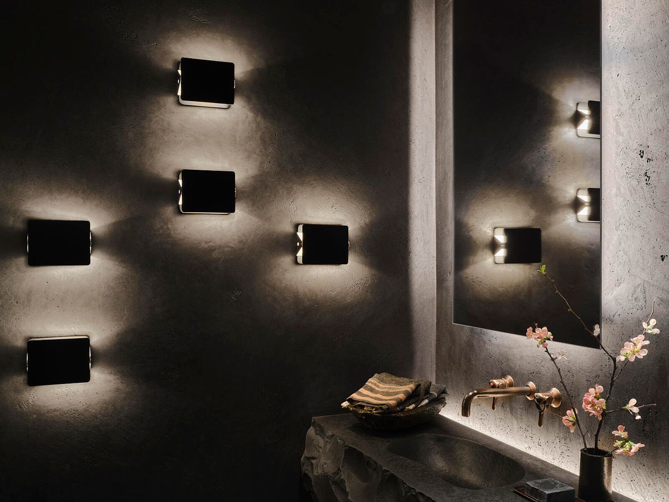 This modern bathroom showcases a striking blend of sleek design and minimalist elegance. The textured, dark wall contrasts beautifully with the gentle glow of strategically placed square sconces, creating a serene ambiance. A bold, sculptural sink made from a unique stone material anchors the space, complemented by polished brass fixtures that add warmth. Fresh blooms in a simple vase introduce a touch of nature, enhancing family-friendly vibes. Soft towels neatly folded atop a textured mat invite comfort, while the mirrored walls amplify light, making this stylish retreat both functional and calming, ideal for a modern household.