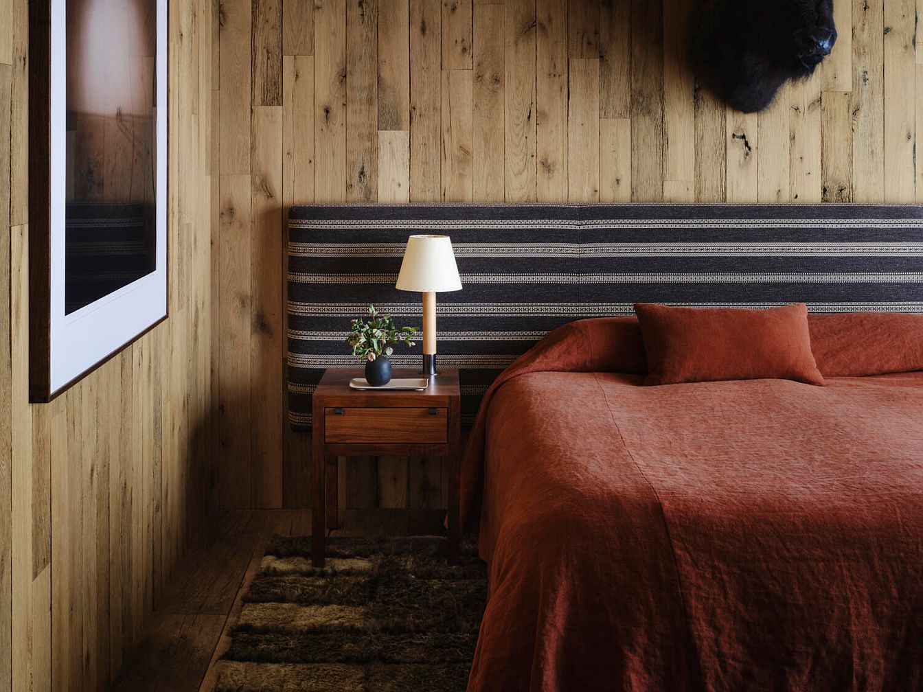 Focusing on a serene master bedroom, warm wood paneling envelops the space, creating a cozy, cabin-like atmosphere. The rich, earthy tones of the rust-colored bedding complement the intricate patterned headboard, adding depth and character. A sleek, wooden nightstand holds a minimalist lamp and a small plant, enhancing the room’s inviting ambiance. Artistic touches, such as a stunning framed photograph, are positioned thoughtfully to draw the eye. Plush textures, from the sumptuous bedding to a soft, furry rug underfoot, ensure comfort and warmth, making this space an ideal sanctuary for relaxation and rejuvenation.