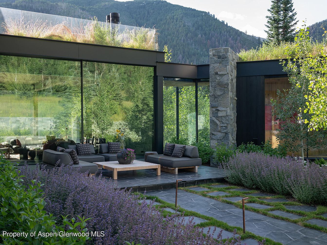 This outdoor living area seamlessly blends modern design with natural surroundings. Expansive glass walls invite breathtaking views of the lush landscape, while the cozy seating area features plush, dark gray sofas adorned with patterned cushions. A minimalist wooden coffee table serves as a focal point, enhancing the layout’s functionality. Surrounding the space, fragrant lavender plants create a harmonious garden, providing color and aroma. Stone pathway accents lead through the greenery, inviting exploration. The architectural details, including the stone wall and green roof, add a unique character to the home, encouraging family gatherings and outdoor relaxation in a serene backdrop.