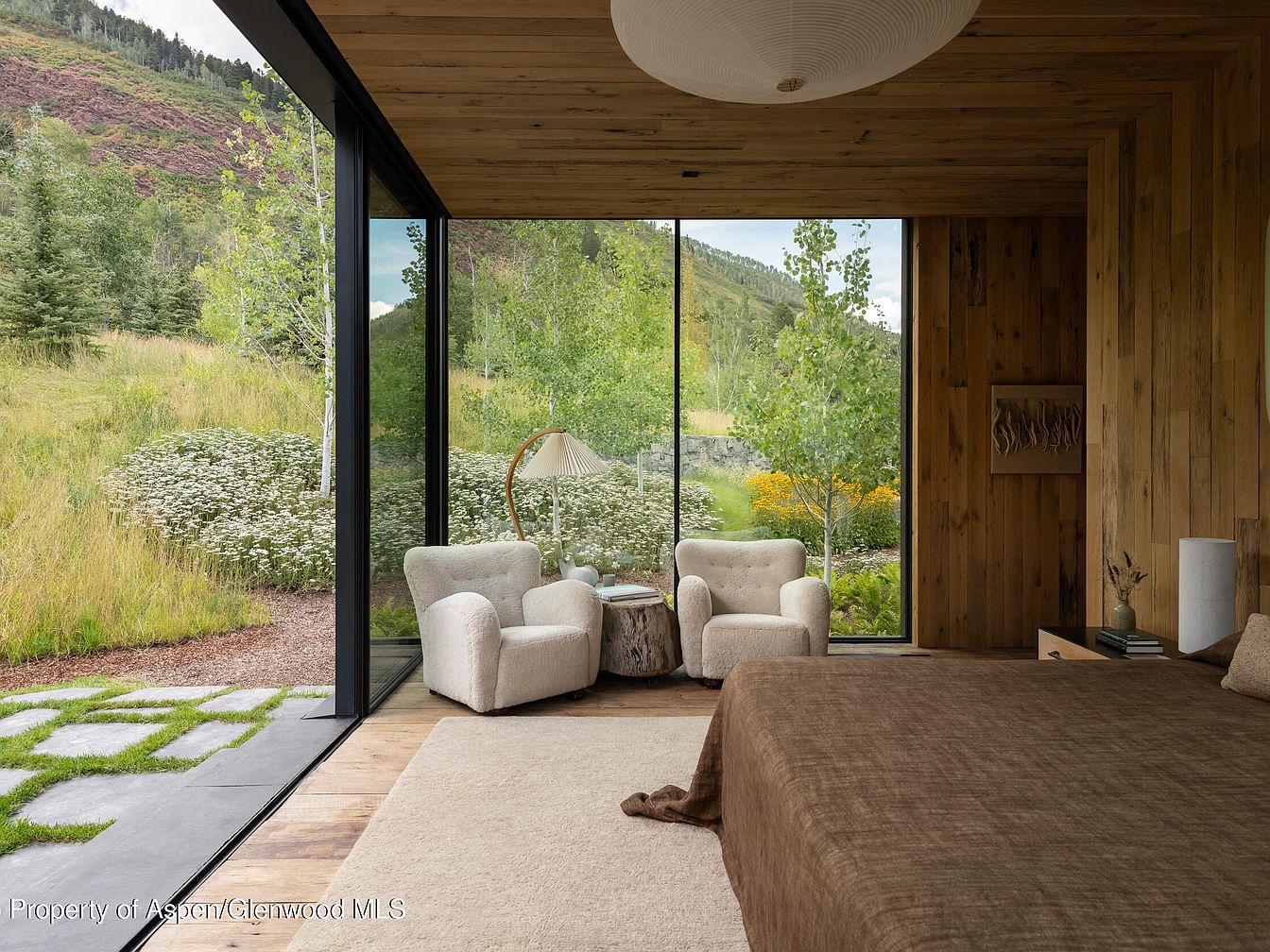 This master bedroom features a harmonious blend of natural elements and modern design, characterized by expansive glass walls that invite abundant sunlight and stunning views of the surrounding landscape. The floors are adorned with warm wood, complemented by a soft, neutral area rug that enhances comfort. A cozy brown bedspread contrasts beautifully with the light textiles of two plush armchairs, creating an inviting nook. The rich wooden paneling adds warmth and a rustic touch, while thoughtful details, such as minimalist lamps and artful decor, emphasize simplicity and elegance. A perfect sanctuary for relaxation and family connection.