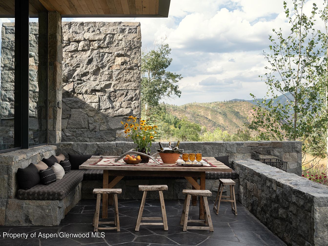 This inviting outdoor dining area seamlessly blends rustic charm with contemporary design, featuring a robust stone wall that complements the stunning natural landscape. The long wooden table, adorned with fresh fruit and sparkling glasses, invites family gatherings and alfresco dining. Surrounded by comfortable, cushioned seating, it ensures a cozy atmosphere for relaxation. The earthy color palette, with deep browns and warm grays, harmonizes with the slate flooring, creating a unified aesthetic. Large windows offer panoramic views, while nearby trees enhance privacy and tranquility, making this space a perfect sanctuary for enjoying meals and scenic vistas.