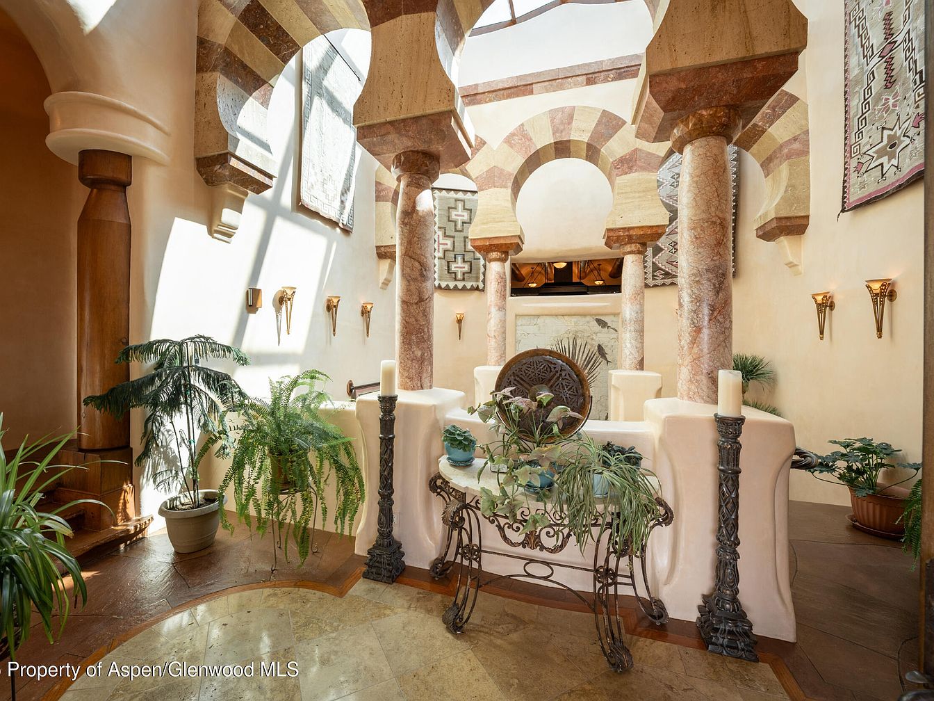 Step into a stunning grand entryway defined by dramatic archways, stately marble columns, and a soaring ceiling that bathes the space in natural light. The warm beige and terracotta palette is complemented by intricate wrought iron detailing, adding an old-world elegance to the decor. Large potted plants bring a touch of nature inside, creating a welcoming atmosphere perfect for families and their guests. Decorative wall sconces and patterned rugs add character and depth to the space, while the open layout and inviting textures encourage easy movement and a sense of comfort. This entryway is both impressive and inviting for every guest.