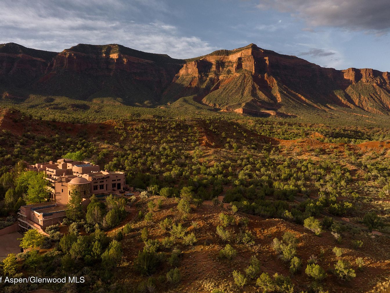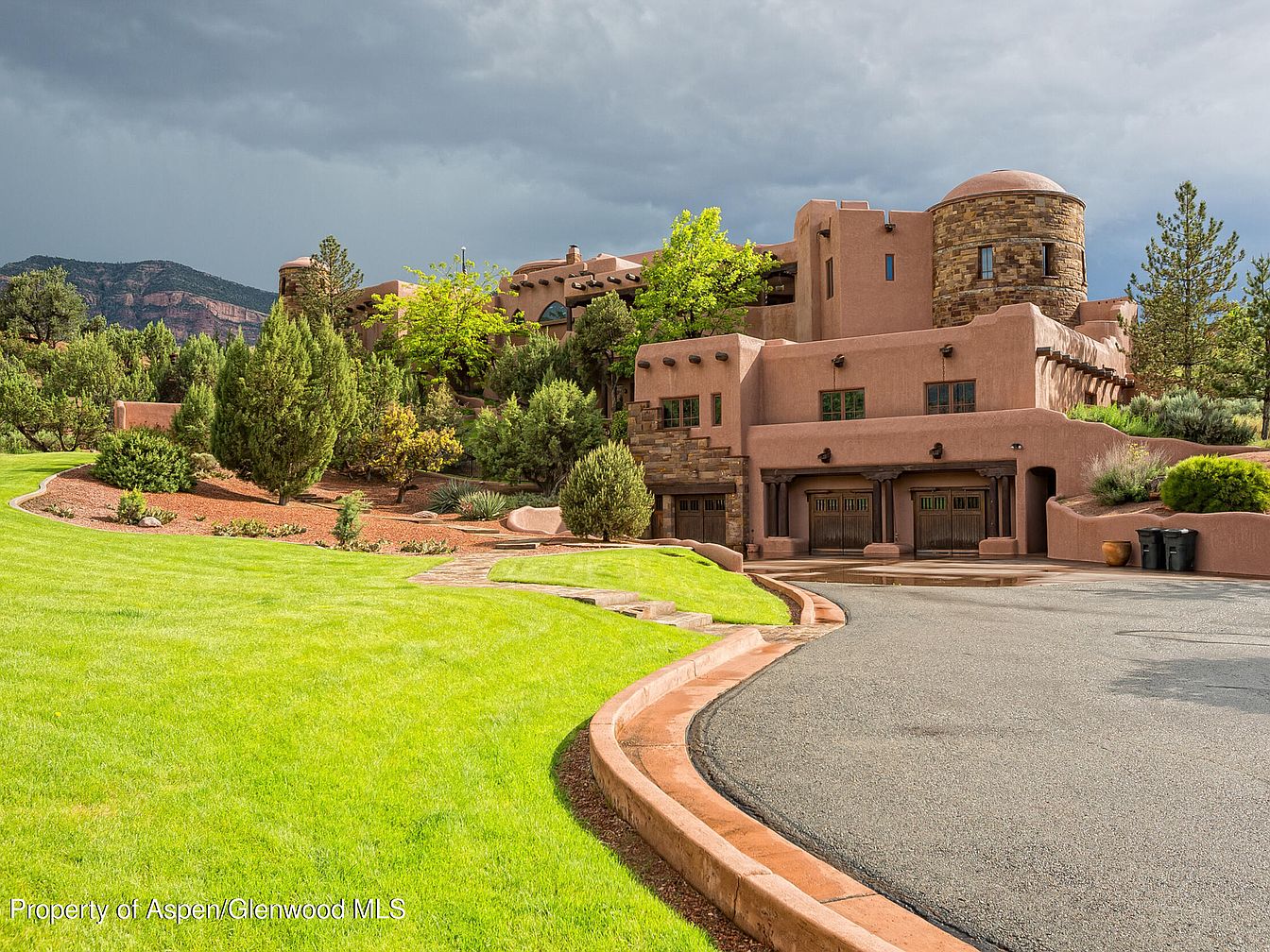 A stunning adobe-style home nestles into the rolling terrain of the American Southwest, blending harmoniously with its red rock surroundings. The residence is crafted with smooth, earthy walls and rounded turrets, reflecting classic southwestern architecture, and is strategically positioned for sweeping views of the dramatic mountains beyond. Lush mature trees and native shrubs surround the property, offering privacy and a family-friendly oasis for outdoor exploration and play. The warm, neutral tones of the exterior enhance the calming atmosphere, making it an inviting and tranquil place to gather, entertain, and connect with nature.