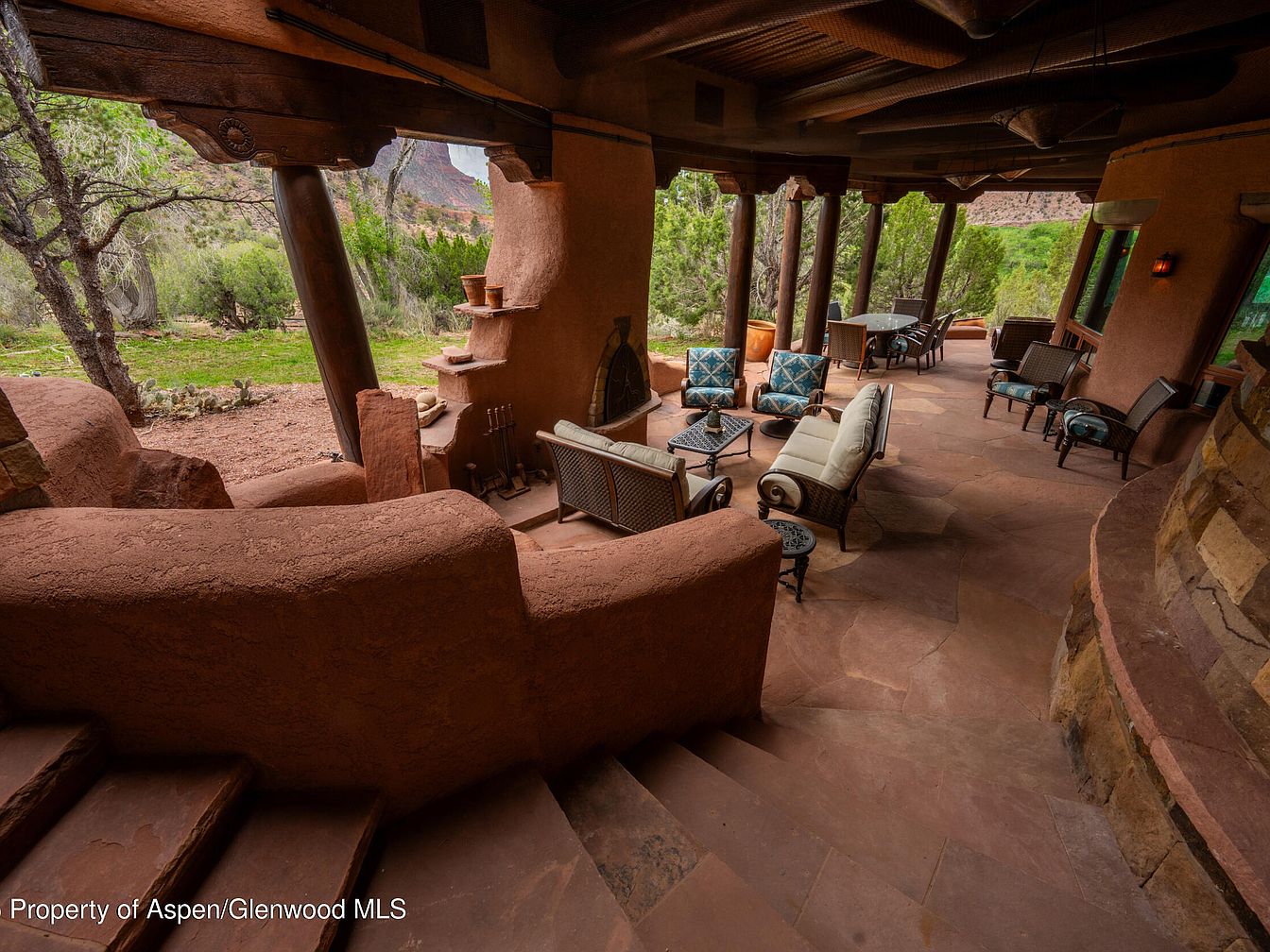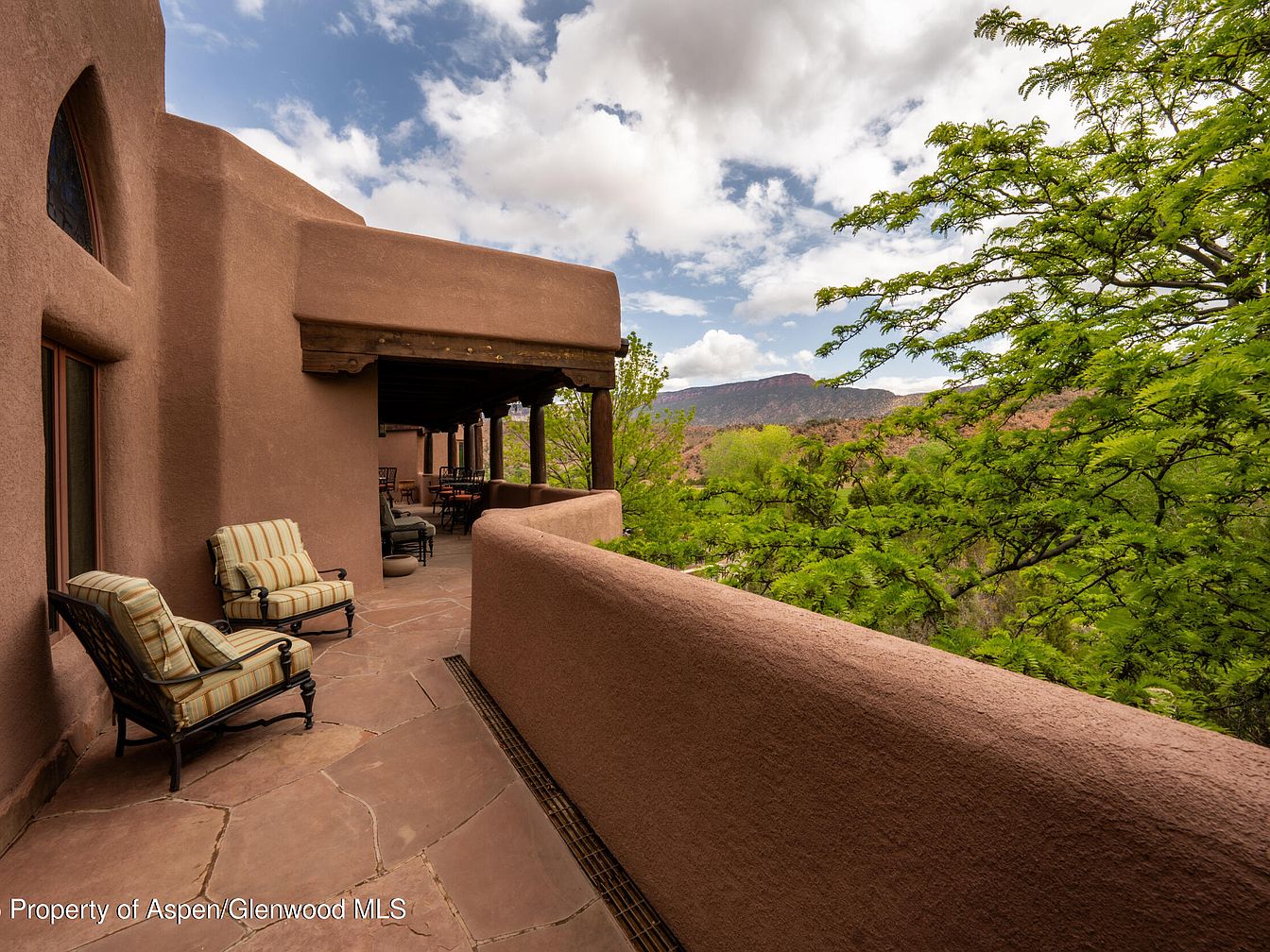 This outdoor terrace offers a peaceful retreat with its earthy adobe walls and natural stone flooring, blending perfectly into the stunning landscape. Overlooking scenic mountain views and surrounded by lush greenery, the space is both private and inviting. Comfortable striped lounge chairs create a perfect spot for family gatherings or quiet relaxation, while the covered portion with additional dining seating ensures versatility in all weather conditions. The warm, neutral tones of the architecture complement the organic surroundings, giving the terrace a cozy Southwestern ambiance ideal for entertaining children safely within its enclosed design or enjoying tranquil moments in nature.