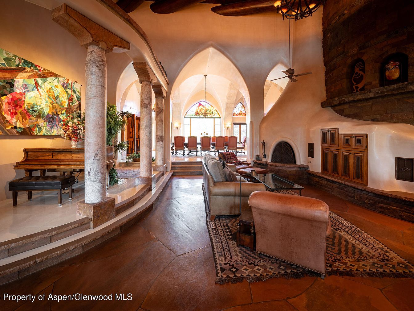 Warm terracotta flooring and curved stonework invite you into a spacious yet cozy living area featuring vaulted ceilings and exposed wooden beams. The room artfully blends Mediterranean and Southwestern influences, highlighted by sturdy stone columns, arched entryways, and a grand piano nestled beside lush greenery. A central fireplace with built-in cabinetry offers family-friendly warmth, while leather seating arranged around a patterned rug creates a welcoming conversation space. Soft, neutral walls and architectural details enhance the natural light streaming through stained-glass windows in the adjacent dining area, creating a harmonious environment suitable for gatherings, relaxation, and family music moments.