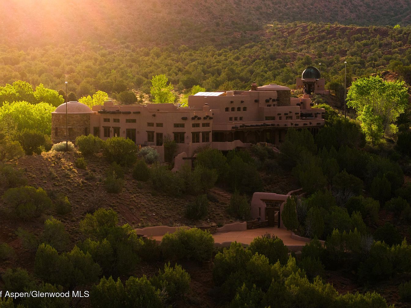 A stunning adobe-style home blends seamlessly with its rugged desert surroundings, highlighted by soft, warm sunlight. The structure features classic Southwestern architecture, including flat roofs, stucco walls in earthy tones, and multiple domed elements that add character and uniqueness. Expansive windows invite natural light and provide breathtaking views of the lush, tree-dotted landscape. The large veranda and terraced landscaping offer inviting outdoor spaces for gatherings and family activities, enhancing the home’s family-friendly appeal. Surrounded by native vegetation, the residence provides both privacy and a harmonious connection with nature, making it ideal for those seeking tranquility and inspiration.