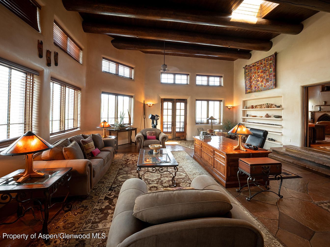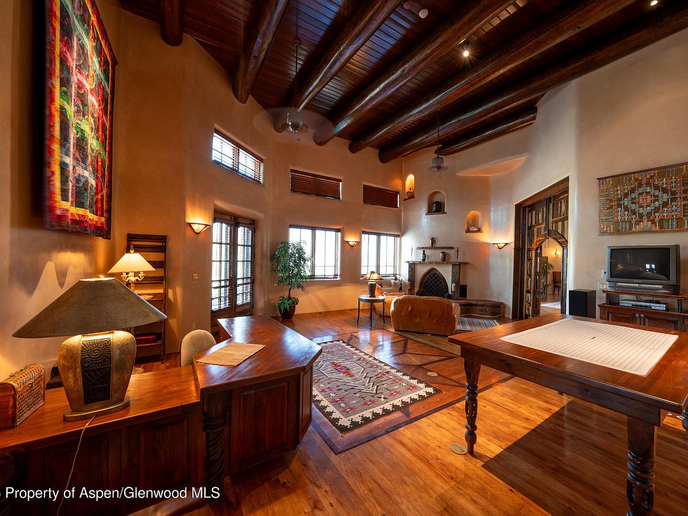 This spacious living room blends Southwestern charm with modern comfort, featuring high ceilings adorned with substantial exposed wooden beams and soft stucco walls in warm earth tones. The open layout provides an inviting and versatile family space, with a central area rug adding warmth and definition. Large windows and French doors usher in natural light, enhancing the cozy sitting area near a classic adobe fireplace. Wood accents and Southwestern textiles infuse character, while the mix of seating, workspaces, and a TV nook offers family-friendly flexibility for work, play, or relaxation. Artistic wall hangings and built-in niches add unique architectural flair.