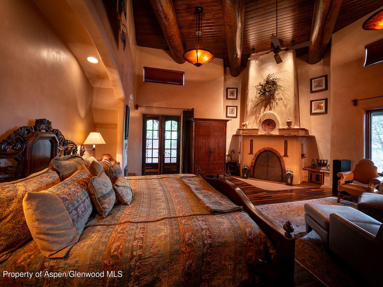 Warm rustic elegance fills this master bedroom, highlighted by a large kiva-style fireplace and beautiful exposed timber ceiling beams. The spacious king bed features an ornately carved wooden headboard and a multitude of plush, patterned pillows that invite relaxation. Earthy tones on walls and bedding create a soothing atmosphere, complemented by wooden furniture and French doors that let in natural light. Cozy armchairs and a soft area rug complete the seating area, making it ideal for family moments. Decorative touches like framed art and dried florals add character, while wide open space offers both comfort and functionality for all ages.