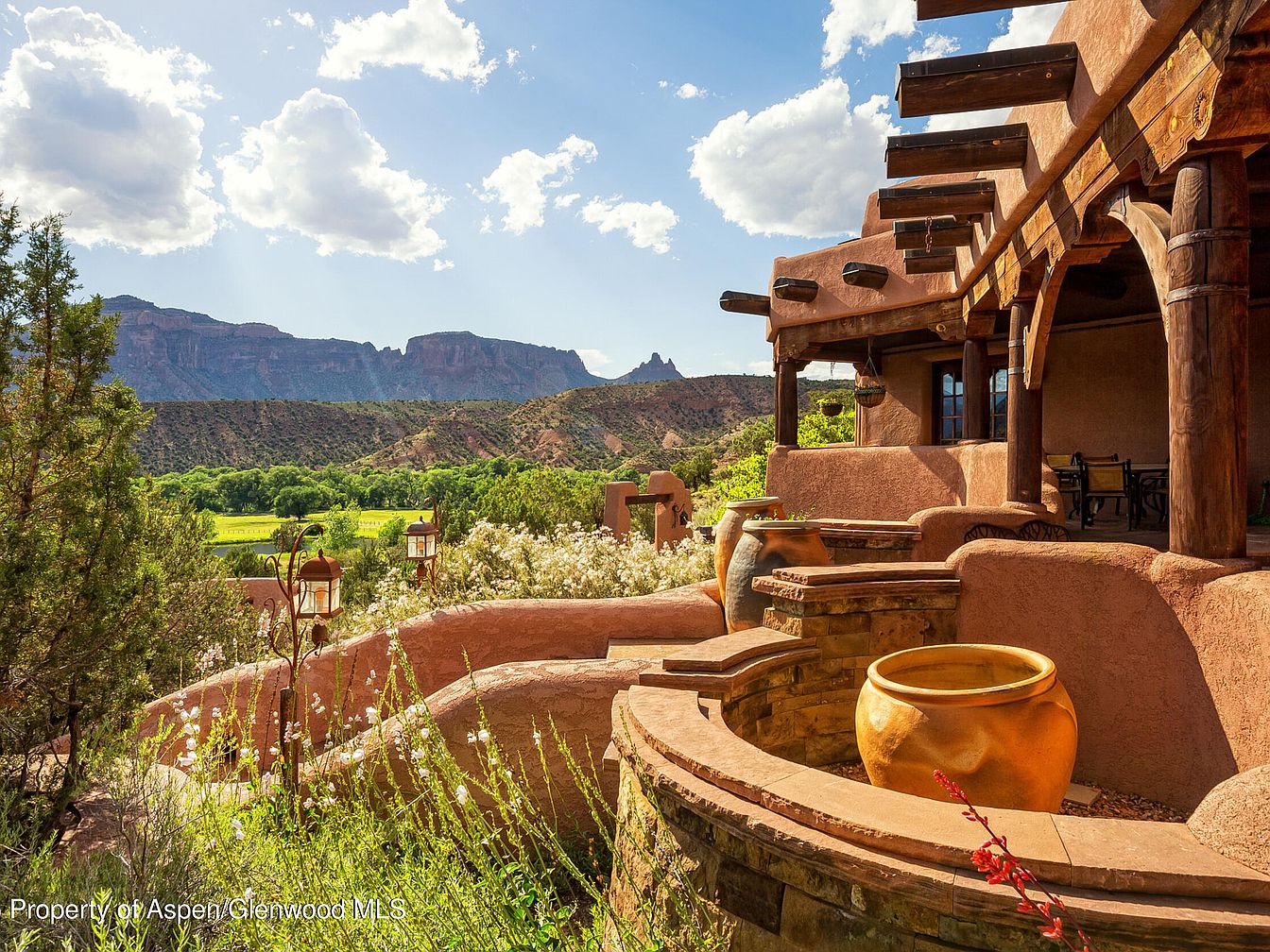 This sun-washed terrace embraces a Southwestern architectural style, featuring stucco walls in warm earth tones and robust wooden beams overhead. The inviting outdoor space is designed for relaxation and gatherings, with built-in stone planter beds and oversized pottery adding rustic charm. Curved stairways lead to multiple levels, guiding family and guests through landscaped gardens and vibrant greenery. Iron lanterns provide soft evening lighting, making the area ideal for alfresco dining or quiet moments. The view captures sweeping mountain vistas and open fields, blending natural beauty with thoughtfully crafted outdoor living that’s both family-friendly and inspiring for all ages.