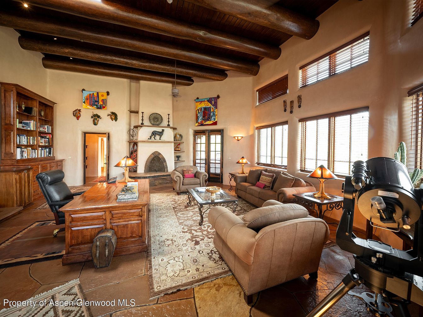 This spacious family room combines relaxation and productivity in a bright, inviting space. High ceilings with exposed wooden beams add a dramatic touch, while large windows fill the area with natural light. Southwest-inspired decor, from the artwork to the cozy fireplace, gives a warm, welcoming atmosphere. The sitting area features plush sofas perfect for lounging or gathering as a family, while a built-in wooden bookshelf and large desk create an ideal study or work corner. The earth-toned color palette, refined rugs, and wrought iron accents beautifully balance comfort with rustic elegance, making it both functional and stylish for everyday living.