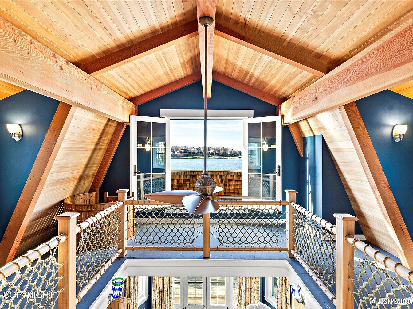 This stunning loft area features a unique architectural design with soaring wooden beams and a warm cedar ceiling, creating an inviting and spacious atmosphere. The deep blue walls serve as a striking backdrop against the natural wood, enhancing the cozy vibe. Expansive sliding doors lead to a picturesque lake view, flooding the space with natural light. The nautical-themed railing adds a charming touch, perfect for a family-friendly home. A contemporary ceiling fan offers comfort in warmer months, while the open layout promotes social interaction. Delicate accents and textured furnishings contribute to the serene and welcoming ambiance.