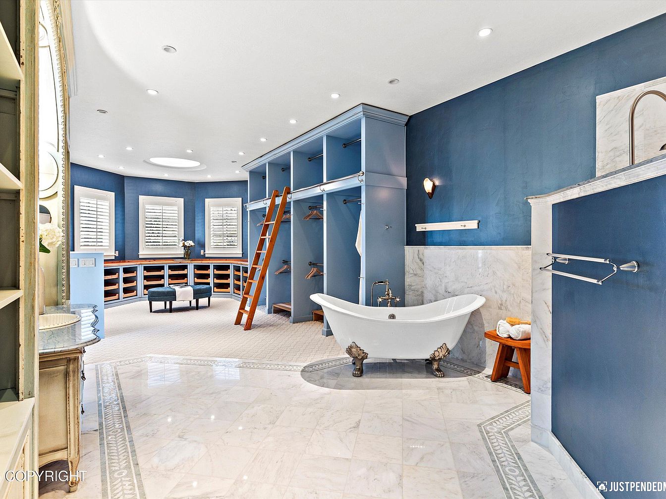 This opulent master bathroom merges functionality with elegance. The spacious layout features a striking clawfoot bathtub as the centerpiece, surrounded by marble flooring that exudes sophistication. A rich blue accent wall provides a bold contrast, while custom wooden cabinetry and shelving offer practical storage solutions. The clever use of natural light from large windows with plantation shutters enhances the overall ambiance. An inviting seating area completes the space, perfect for relaxation. Thoughtfully placed lighting fixtures highlight architectural details, ensuring both warmth and style in this exquisite retreat. This bathroom is designed not only for luxury but also for everyday comfort.