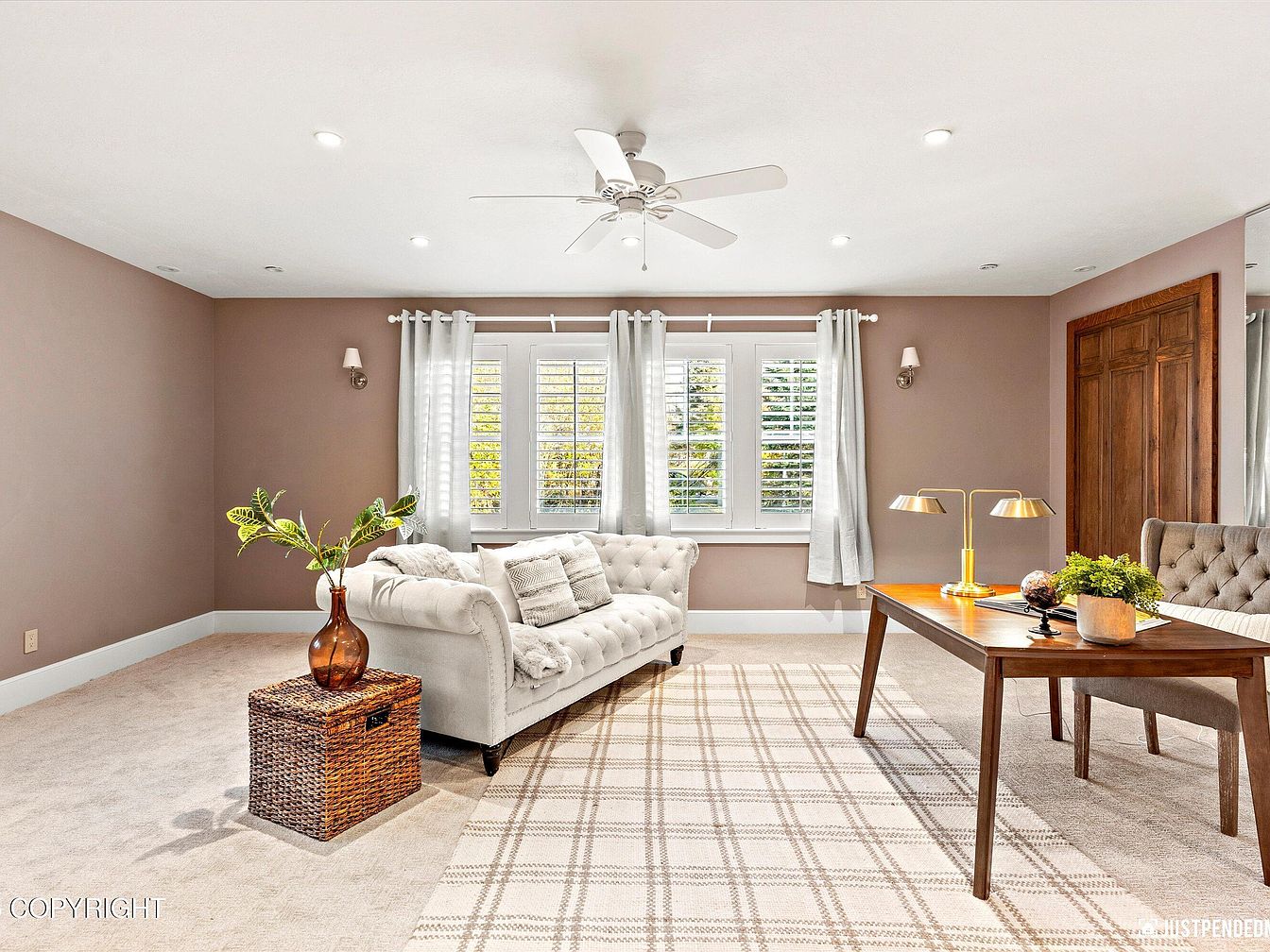 This inviting family room features a harmonious blend of comfort and elegance, defined by a soothing taupe color palette. The plush, tufted sofa offers ample seating and is perfectly complemented by a stylish accent chair. Natural light streams through plantation shutters, highlighting the soft textures of the carpet and woven basket. A sleek wooden table adorned with a modern lamp and decorative plant creates a cozy workspace. Architectural details like wall sconces add warmth, while the ceiling fan contributes to airiness, making this space ideal for family gatherings and relaxation in a warmly welcoming environment.