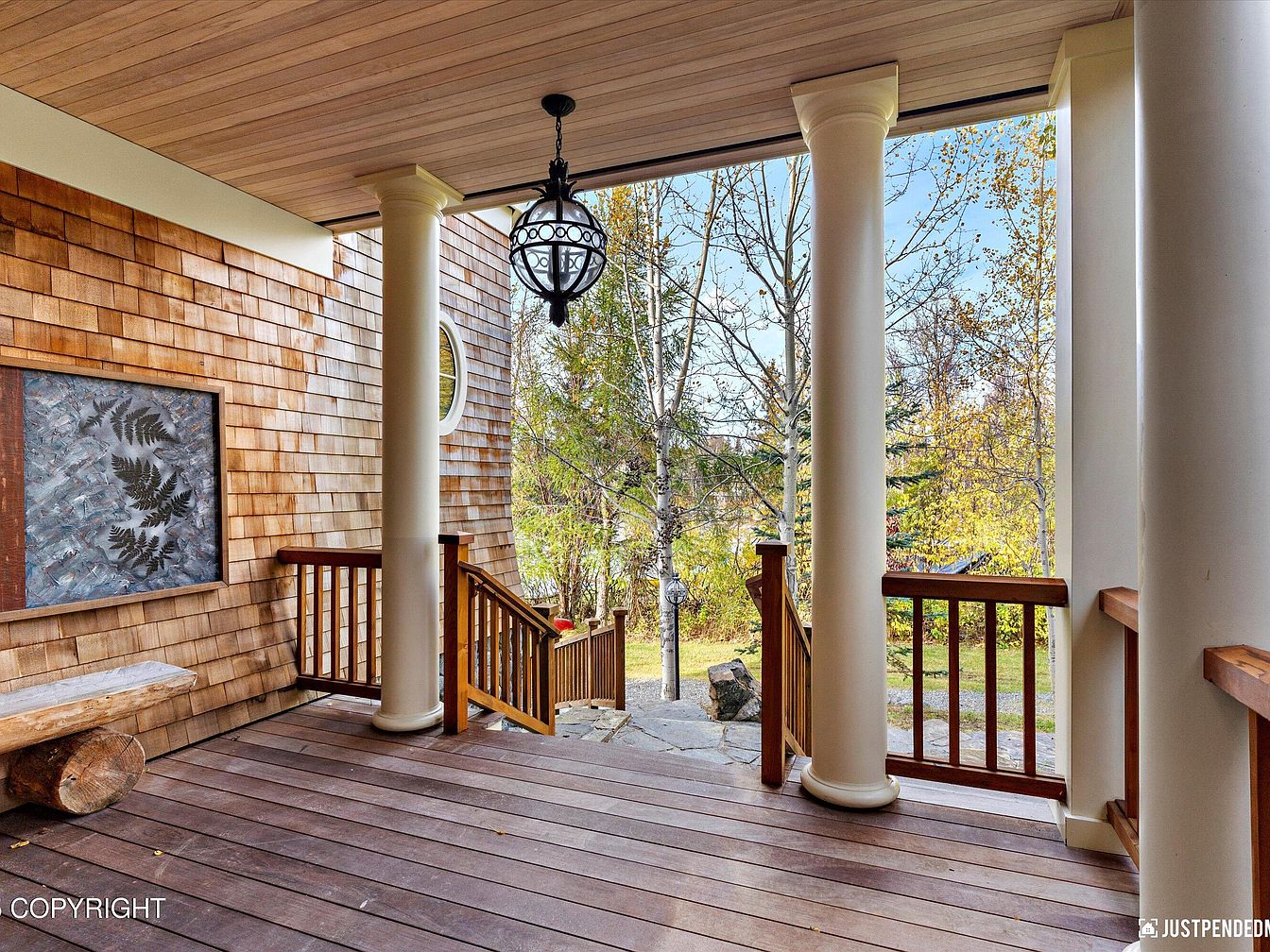 This stunning outdoor deck showcases a beautifully crafted wooden patio, elevated above a lush green lawn. The architecture features intricately designed wooden railings and substantial columns, providing both strength and visual interest. The color palette includes warm wooden tones that complement the home’s natural cedar shingle siding. Expansive glass windows allow natural light to flood the interior, creating an inviting atmosphere. Family-friendly amenities include spacious areas for gatherings and entertainment, perfect for summer barbecues or cozy evenings. The design seamlessly blends comfort and elegance, making it an ideal space for relaxation and enjoying the surrounding landscape.
