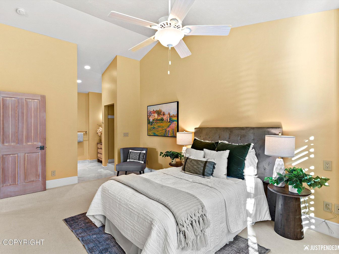 This inviting master bedroom exudes warmth and tranquility through its soft, yellow walls that create a welcoming atmosphere. The elegantly styled bed features a plush, gray headboard adorned with a collection of cozy pillows in muted greens and whites, harmonizing beautifully with the neutral tones of the decor. A bedside table, crafted from rich wood, complements stylish lamps that provide gentle illumination. The room boasts a high ceiling, enhanced by a ceiling fan for airflow. A cozy chair in the corner adds a thoughtful touch for reading, while natural light streams in, creating an open and airy feel throughout.